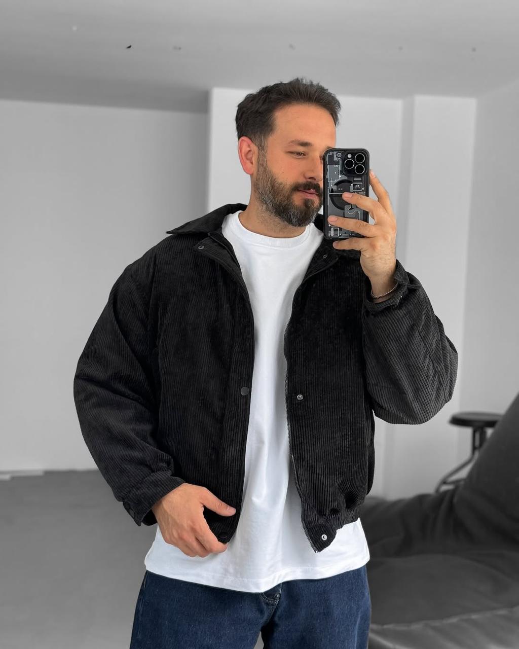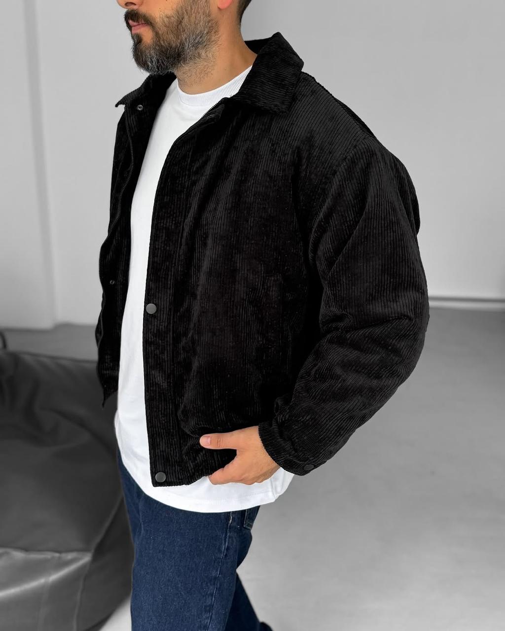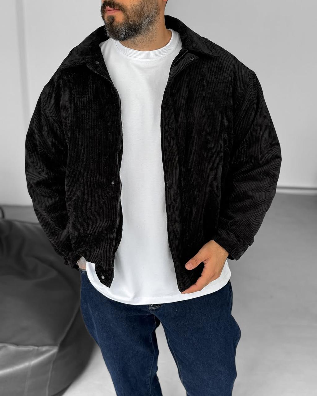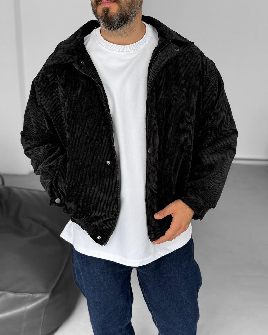 Чоловіча Демісезонна Вельветова Чорна Куртка Бомбер з Відкладним Коміром