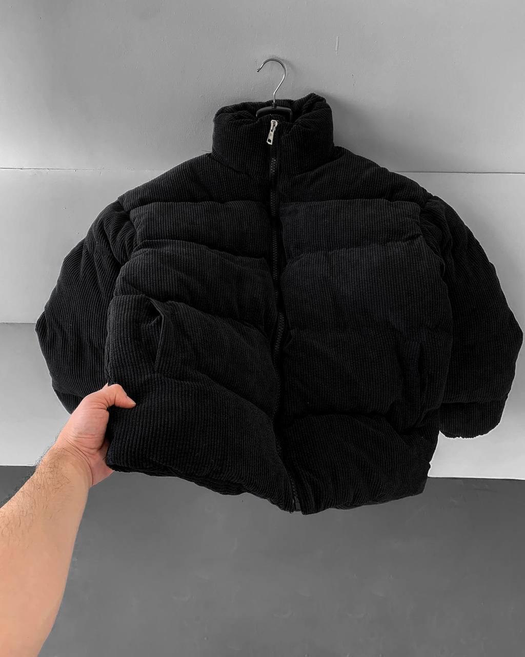 Чоловіча Демісезонна Вельветова Чорна Куртка з Високою Горловиною – Стьобана на Блискавці