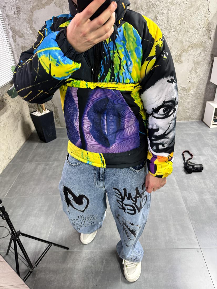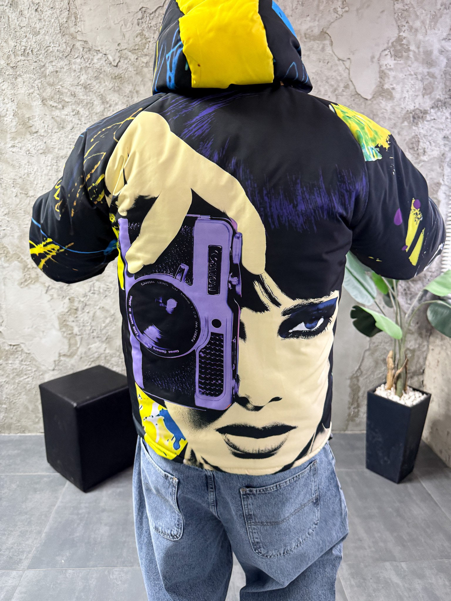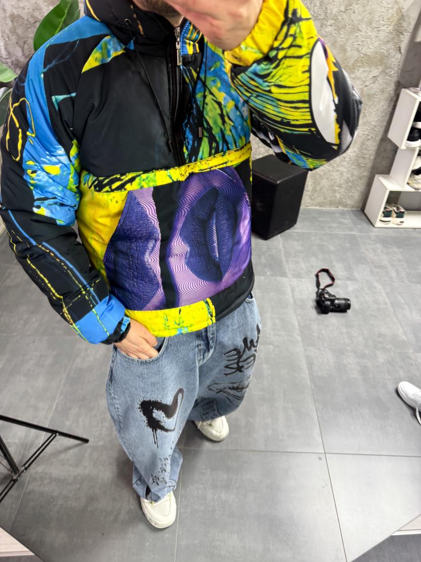 Чоловічий Утеплений Чорний Анорак Плащівка з Капюшоном в Яскравий Принт
