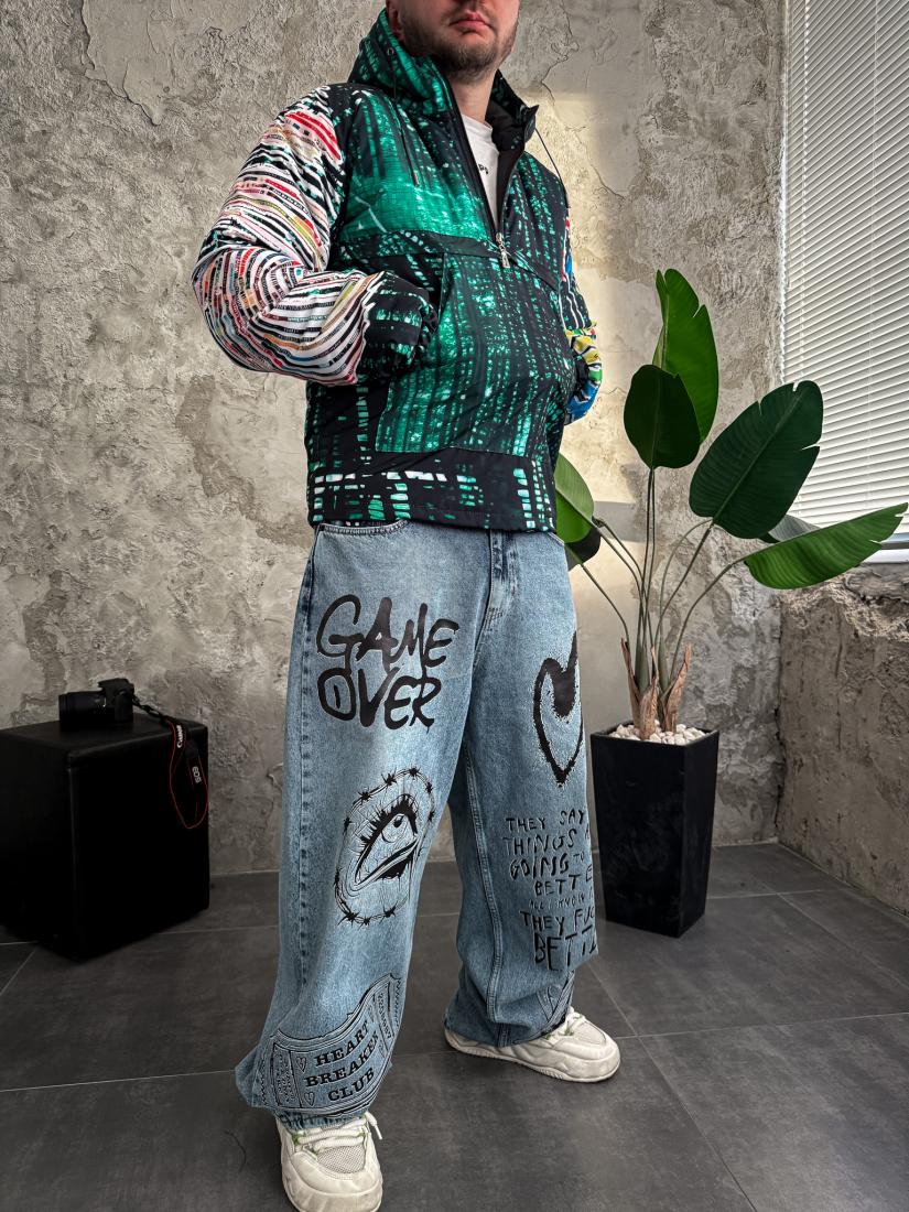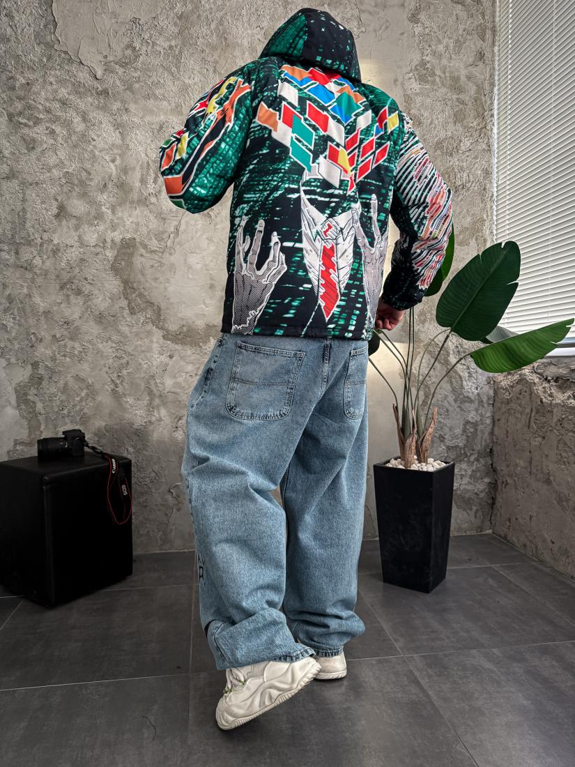 Головна Каталог Чоловіче Куртки Осінь - Весна Чоловічий Утеплений Зелений Анорак Плащівка з Капюшоном в Яскравий Принт