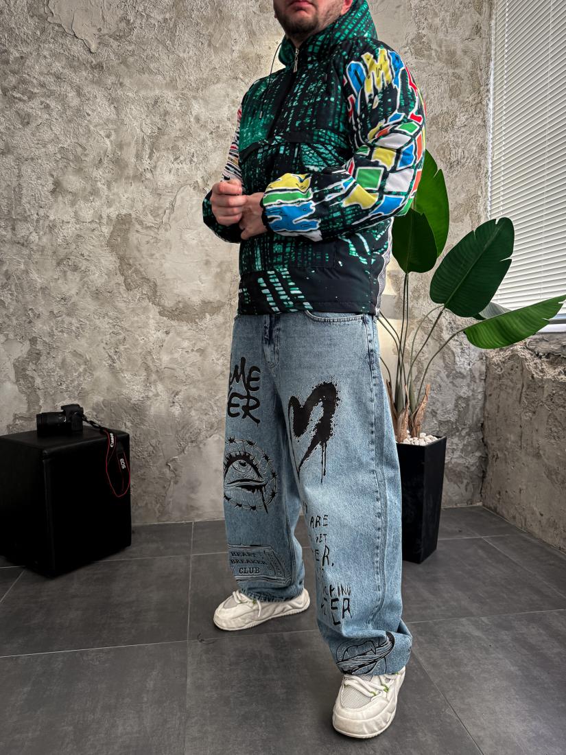 Чоловіча Стьобана Куртка з Капюшоном в Синьому Кольорі Короткий Пуховик з Яскравим Принтом