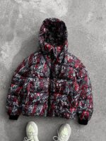 Чоловіча Тепла Чорно-Червона Куртка на Зиму під Горло з Капюшоном та Манжетами в Принт Кастет