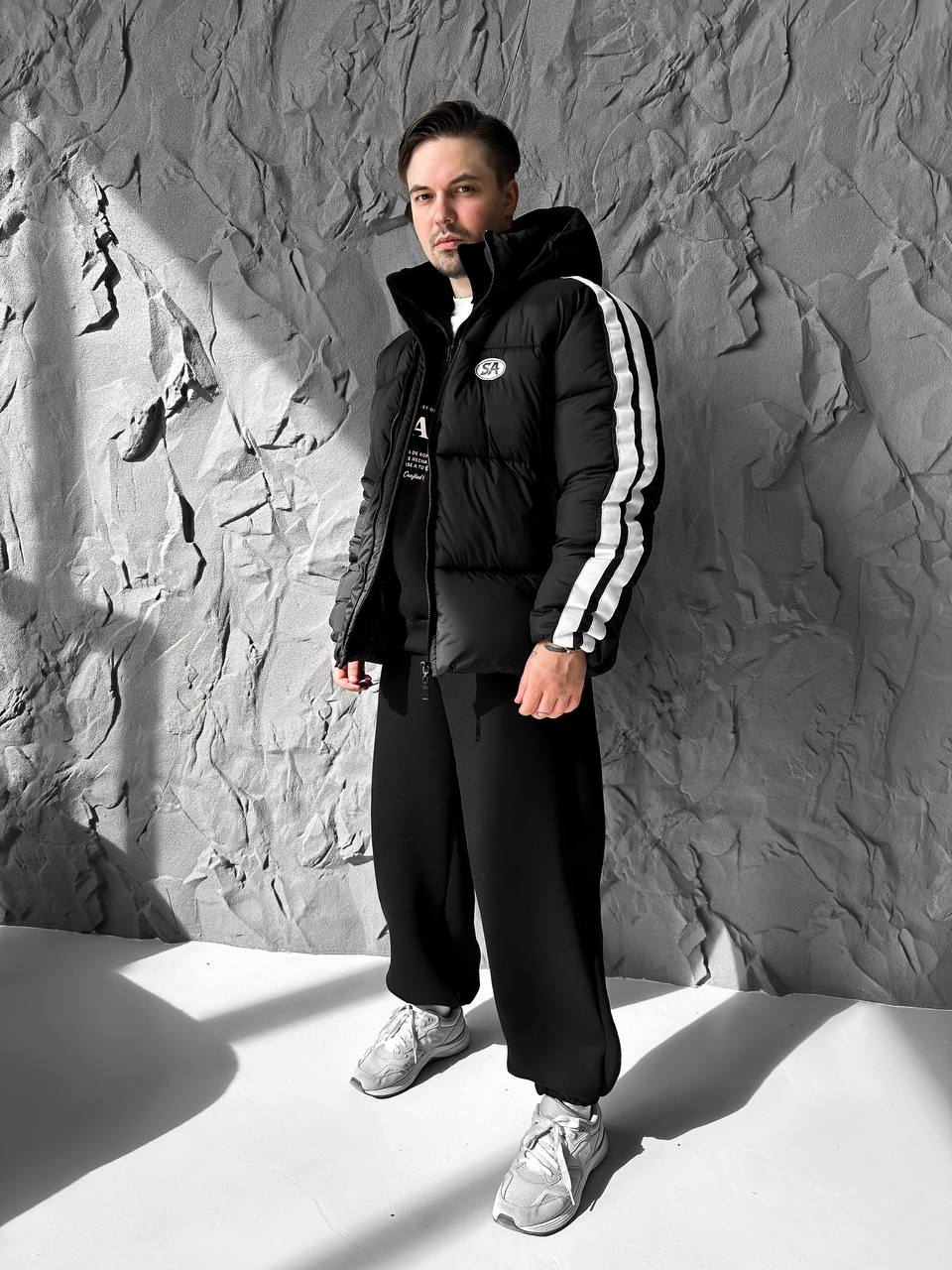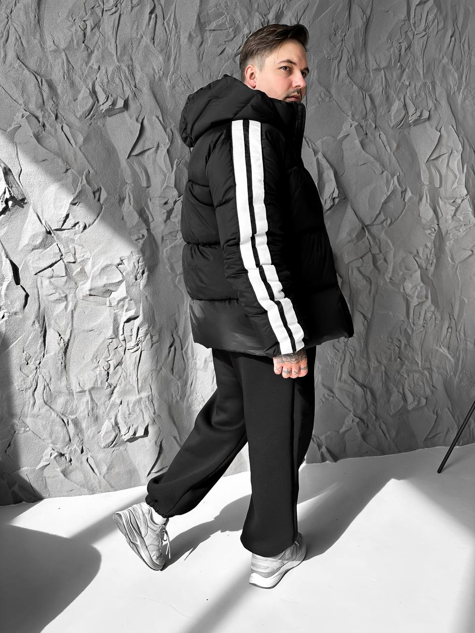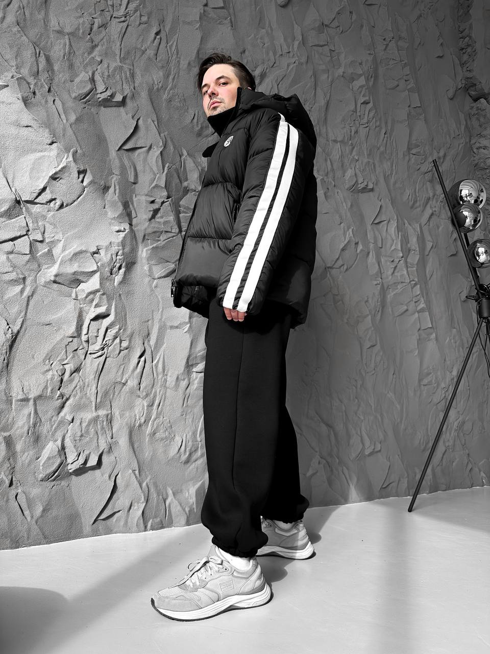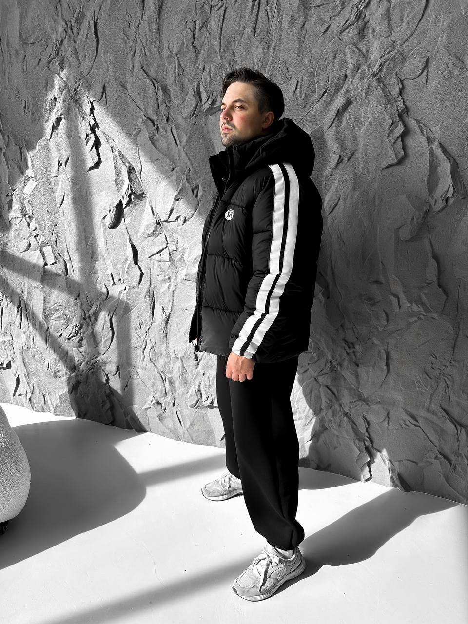 Чоловіча Зимова Чорна Дута Куртка з Капюшоном і Лампасами