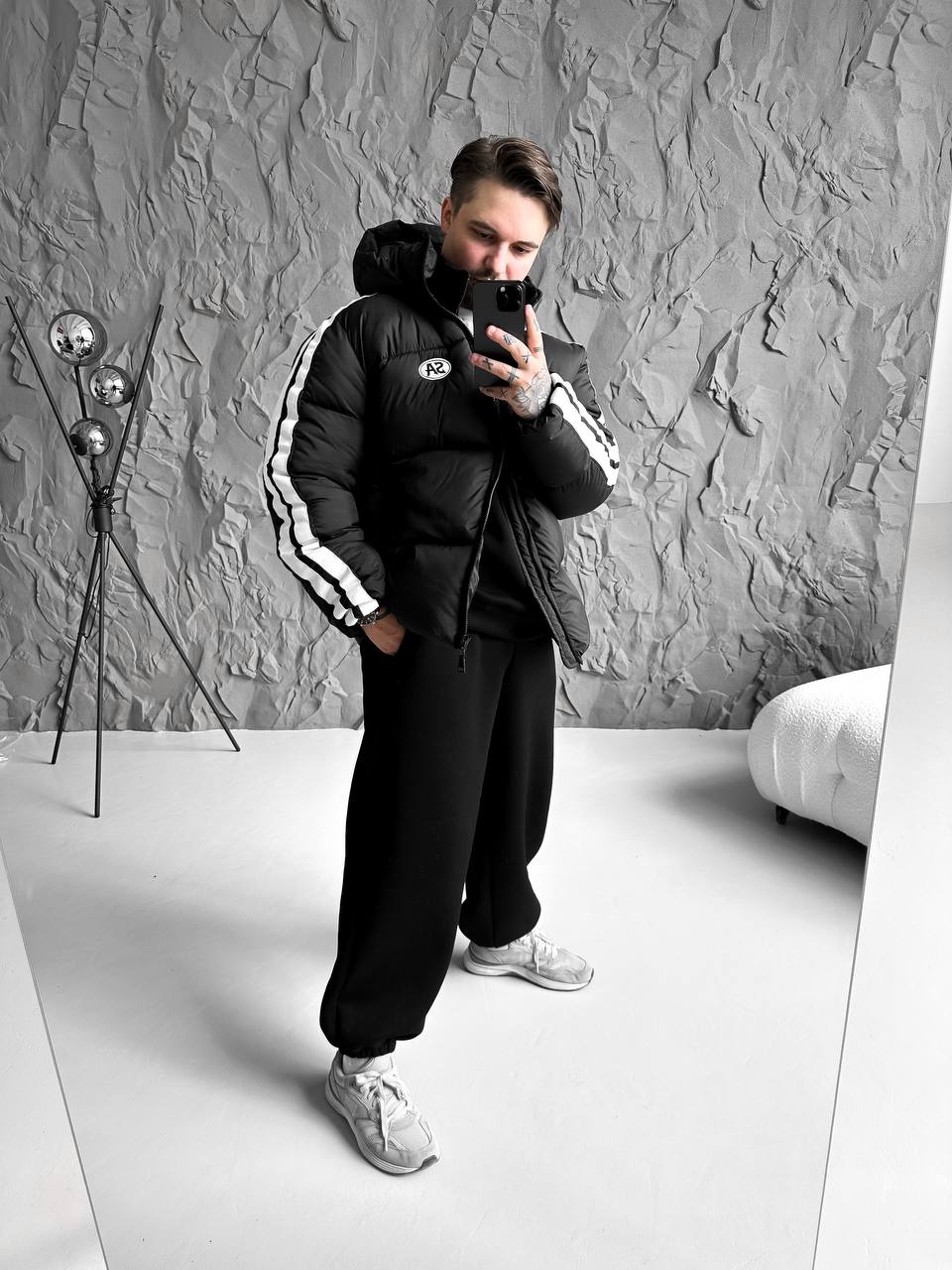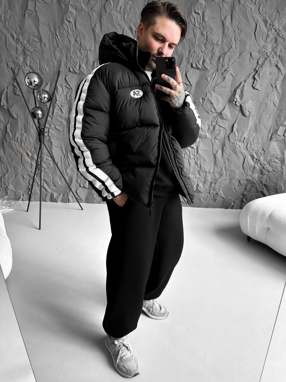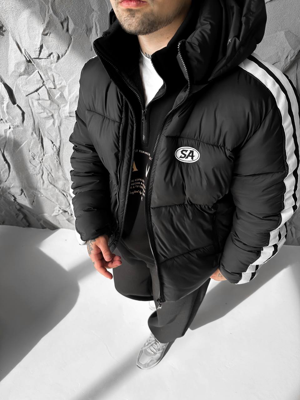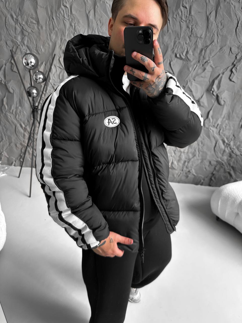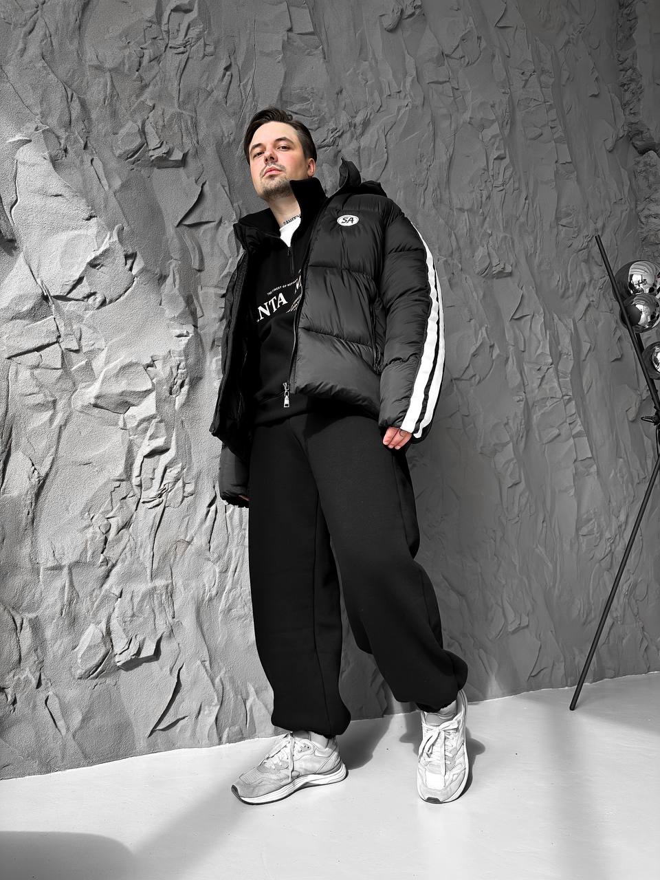 Чоловіча Зимова Чорна Дута Куртка з Капюшоном і Лампасами