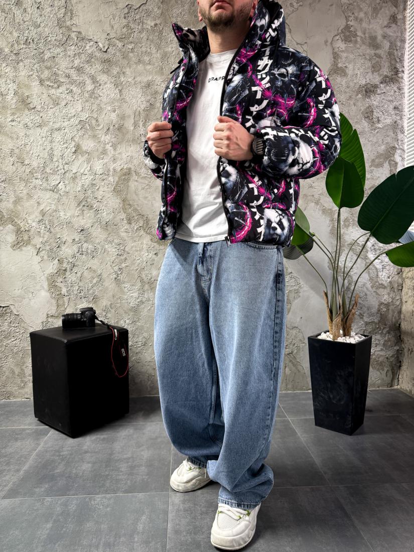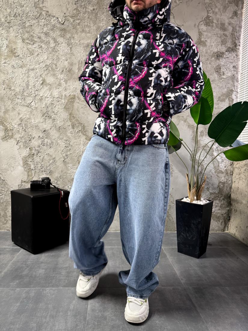 Чоловіча Зимова Чорна Куртка з Капюшоном та Високим Горлом – Пуховик в Принт Панди