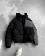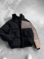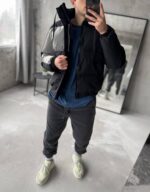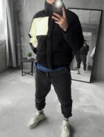 Чоловіча зимова чорна куртка з коміром стійкою і світловідбиваючою вставкою.