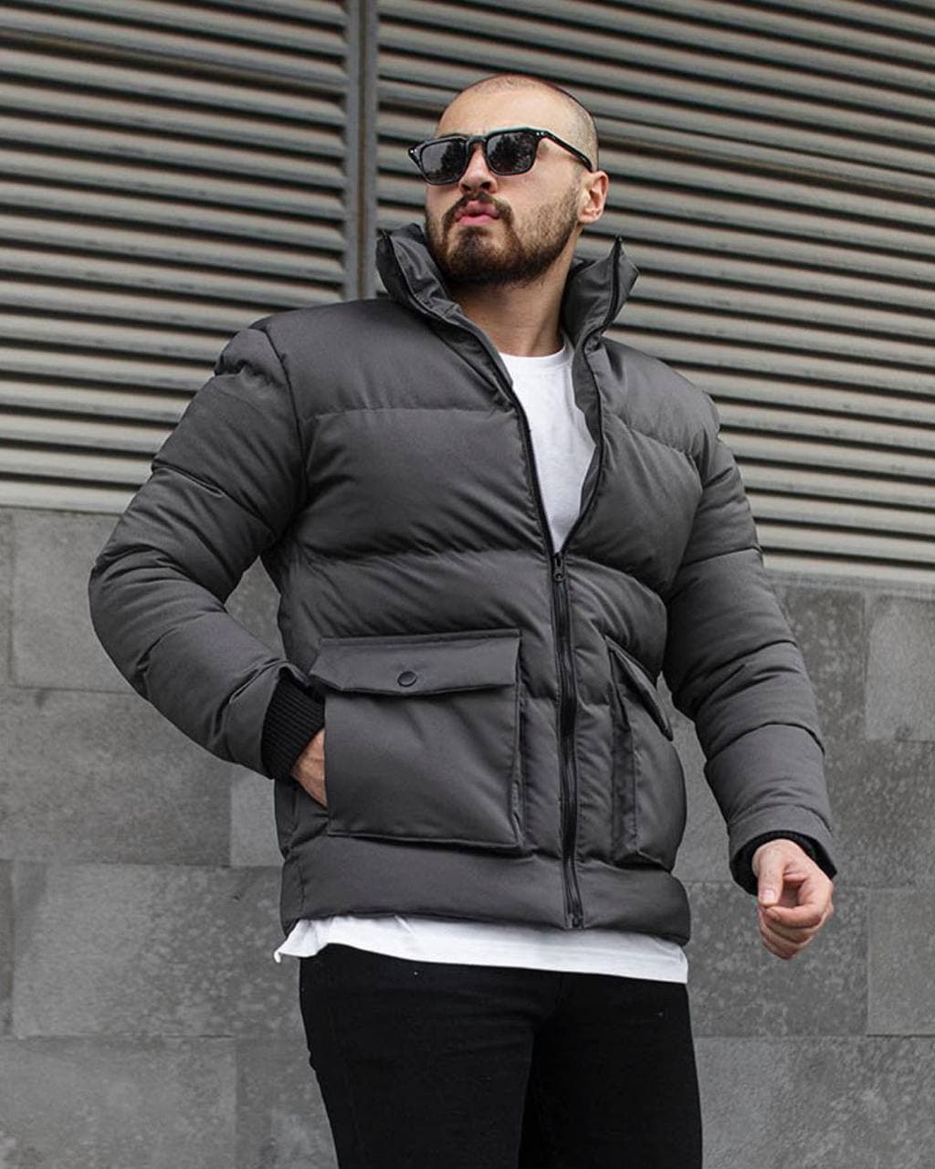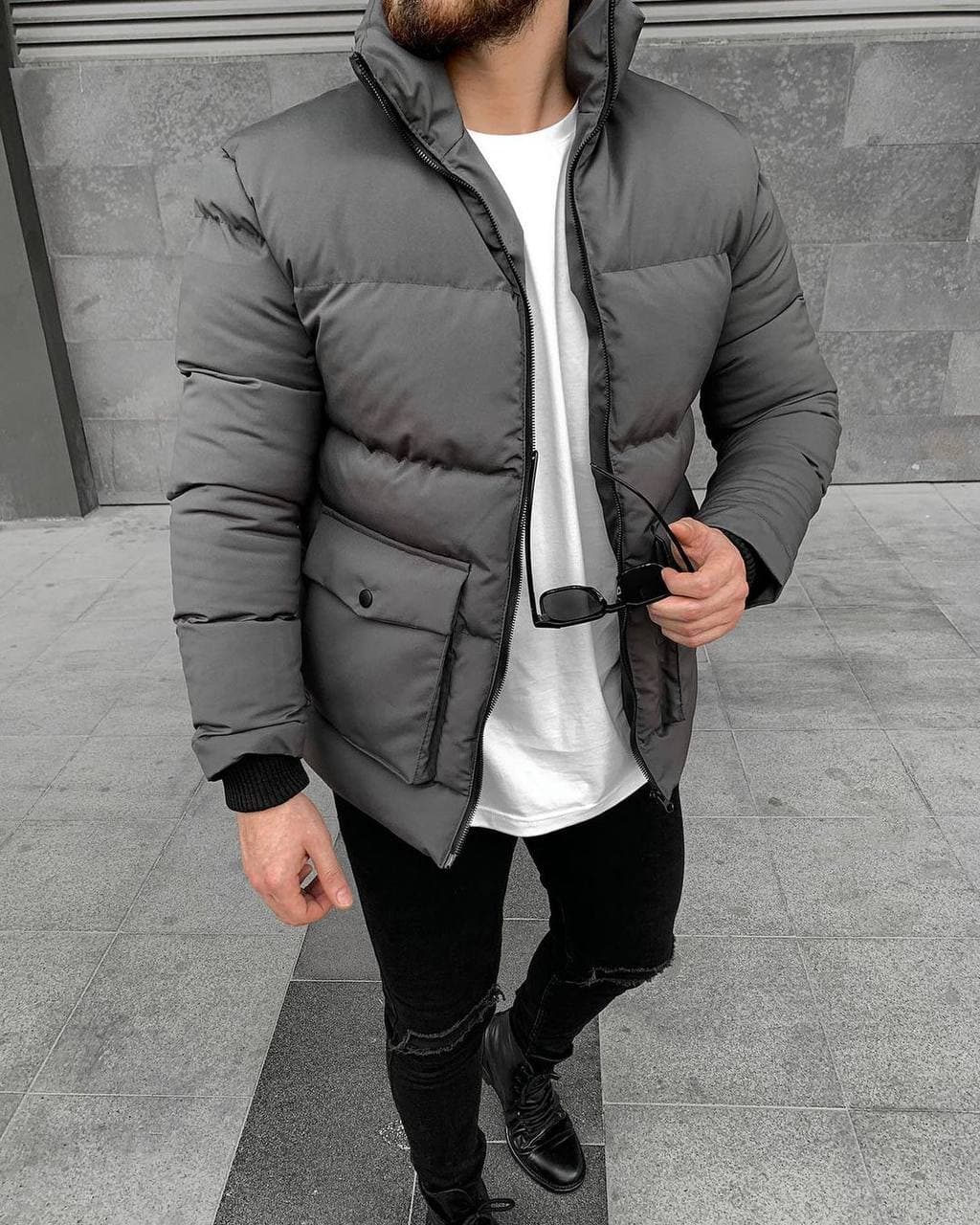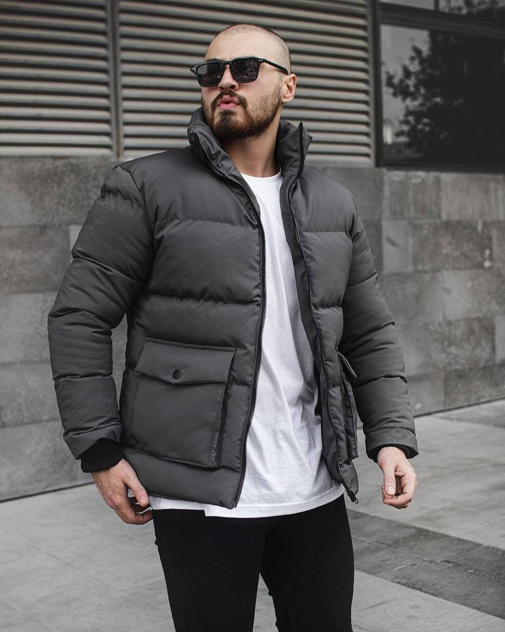 Чоловіча зимова куртка сіра – стьобана без капюшона з накладними кишенями.