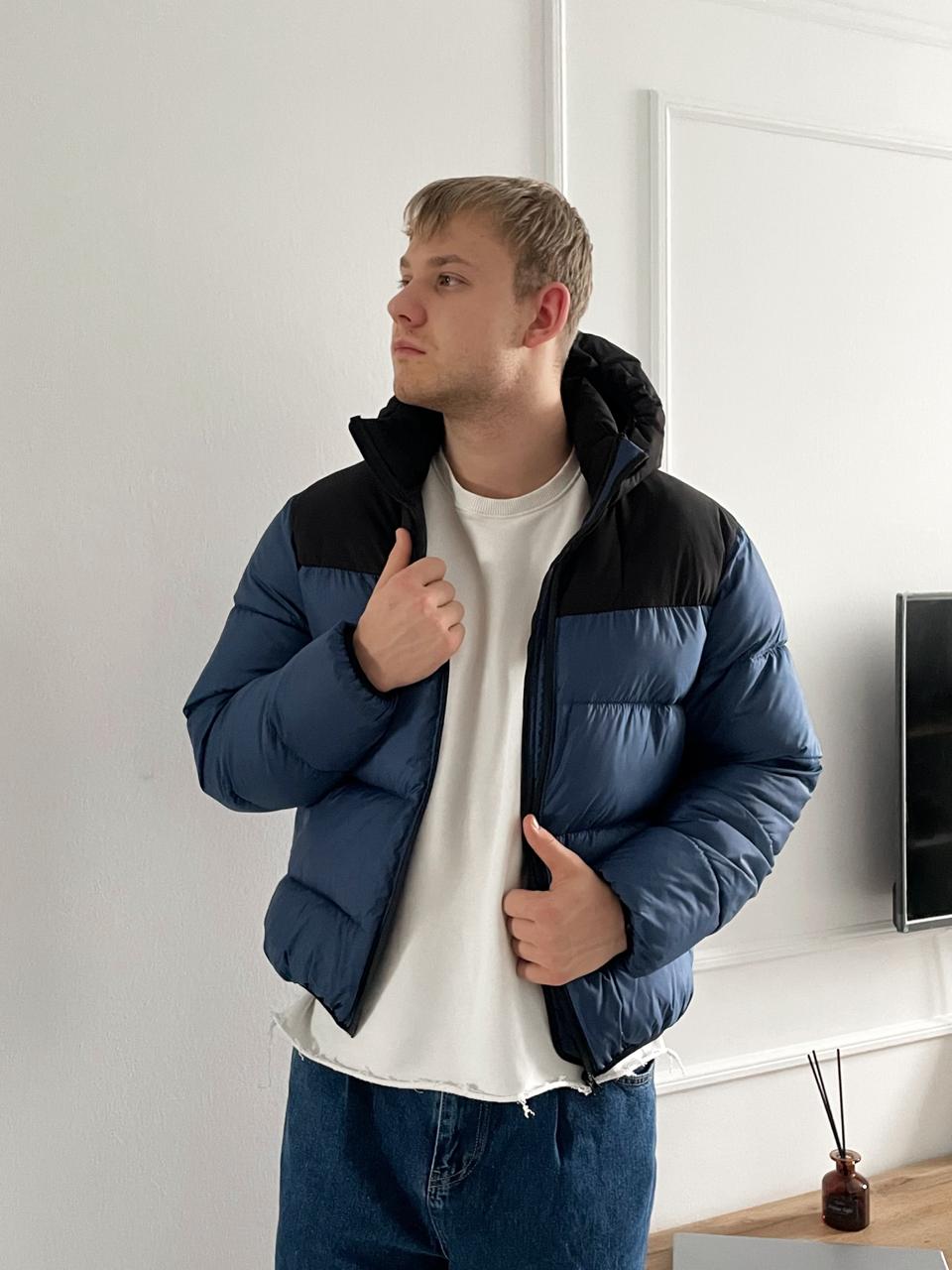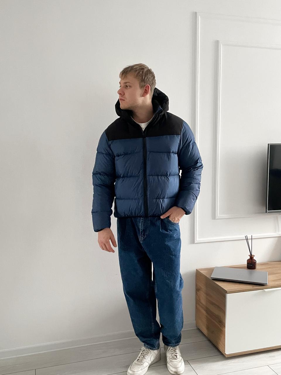 Чоловіча Зимова Стьобана Синя Куртка з Чорним Капюшоном