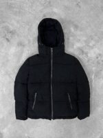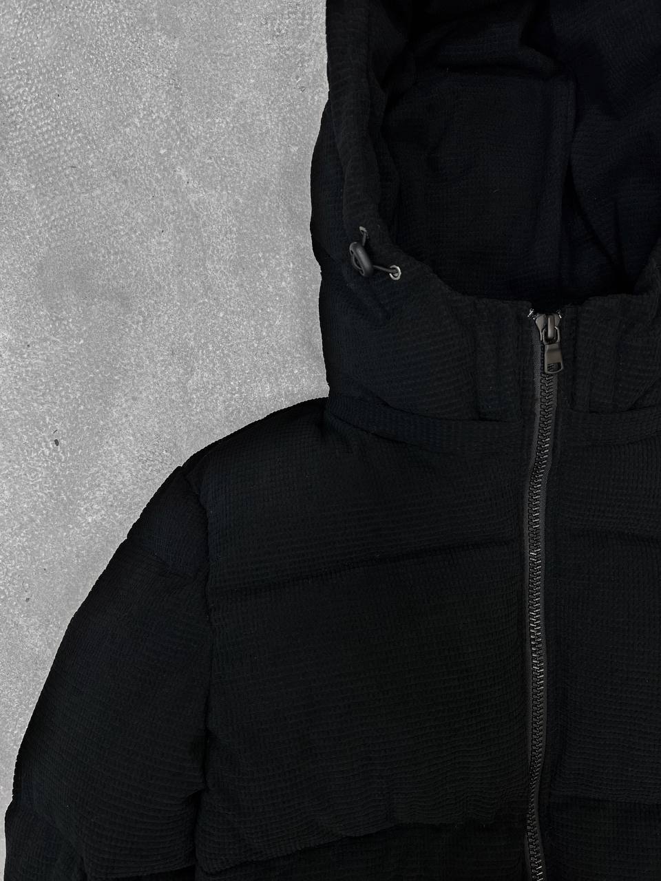 Чоловіча зимова вельветова чорна куртка під горло з капюшоном на затяжках.