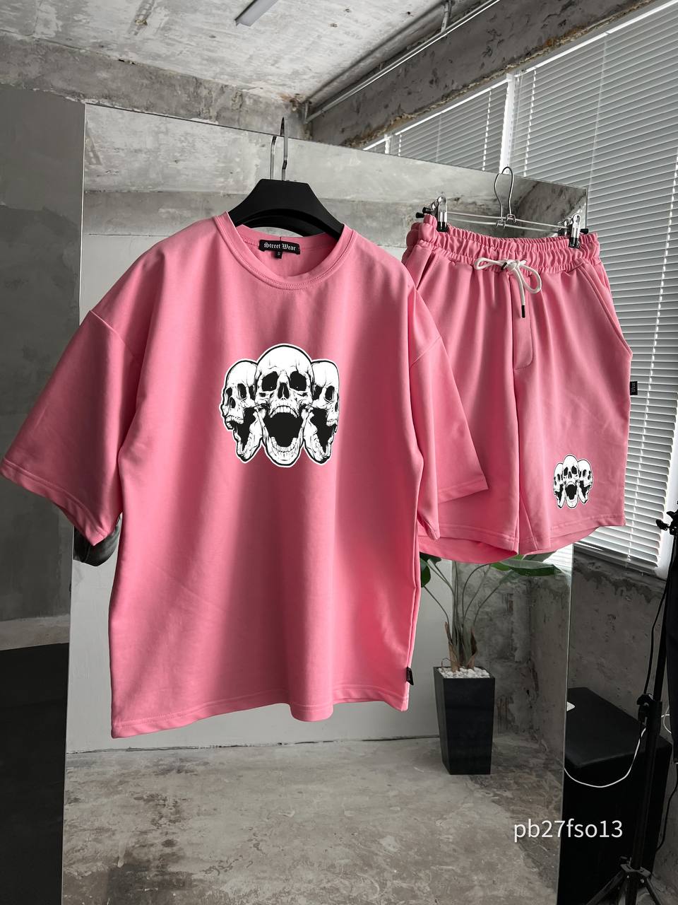 Чоловічий Бавовняний Рожевий Літній Костюм Принт Черепа (Футболка + Шорти)