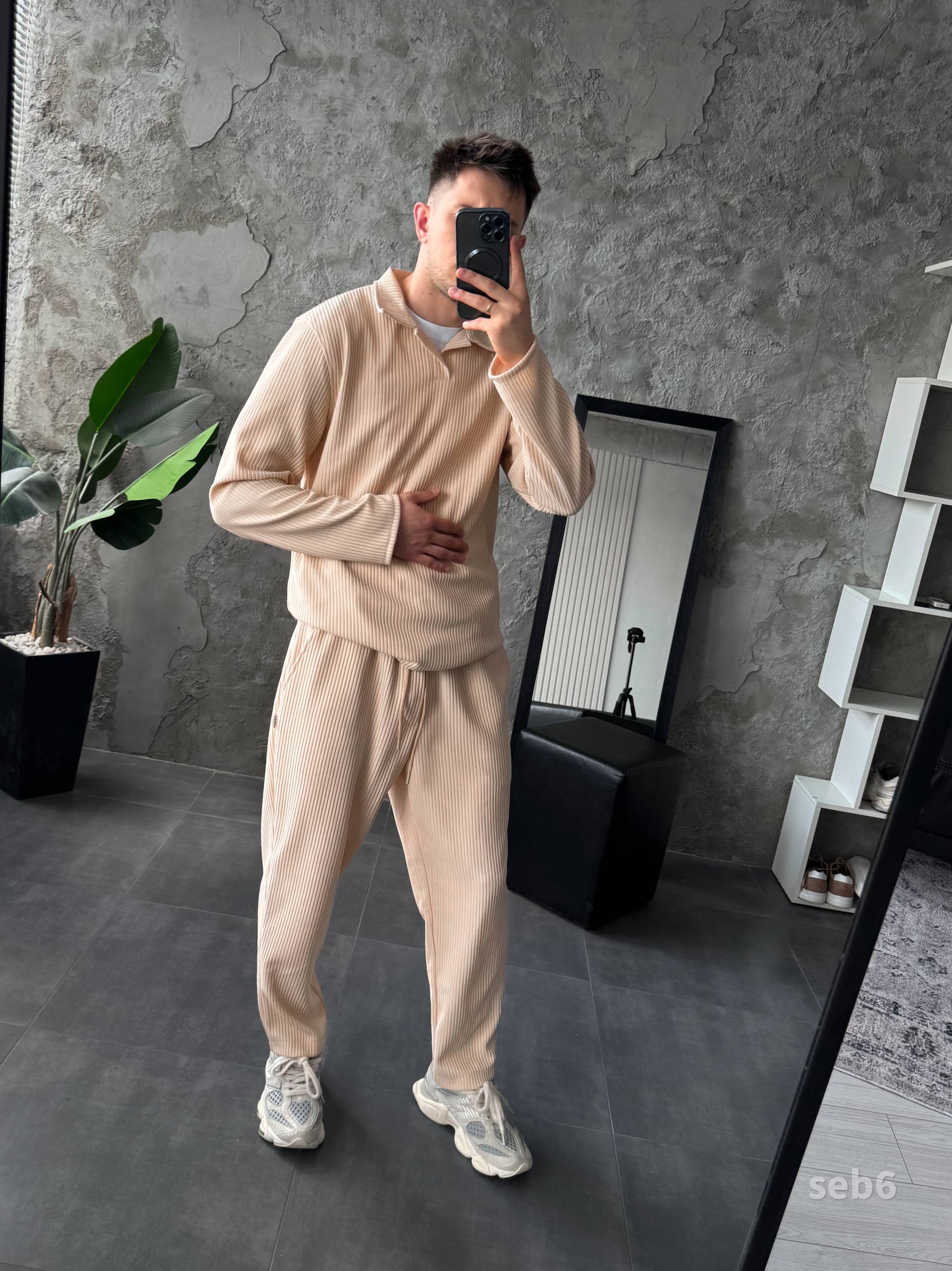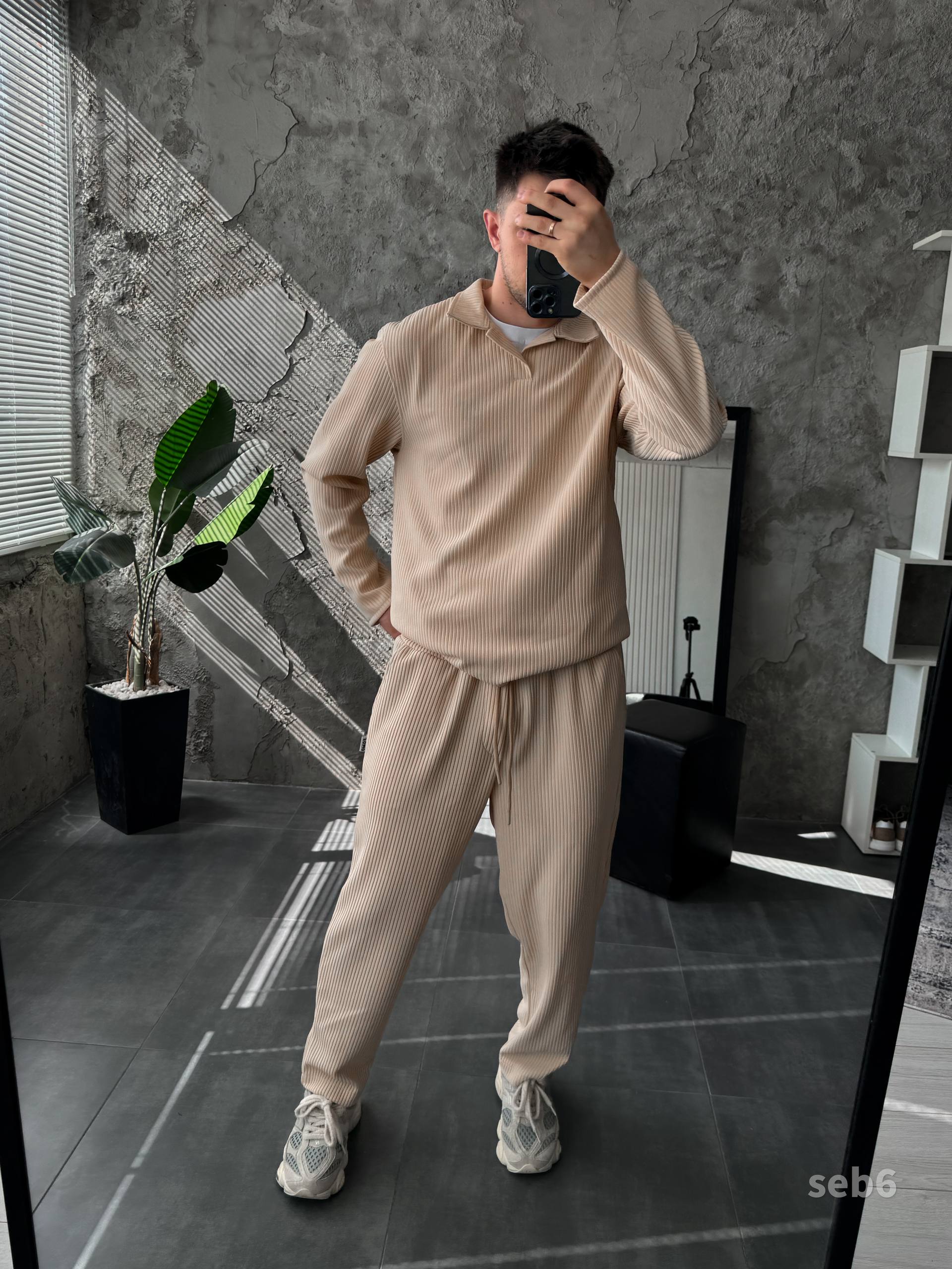 Чоловічий Базовий Бежевий Костюм в Рубчик – Кофта Поло + Штани на Резинці