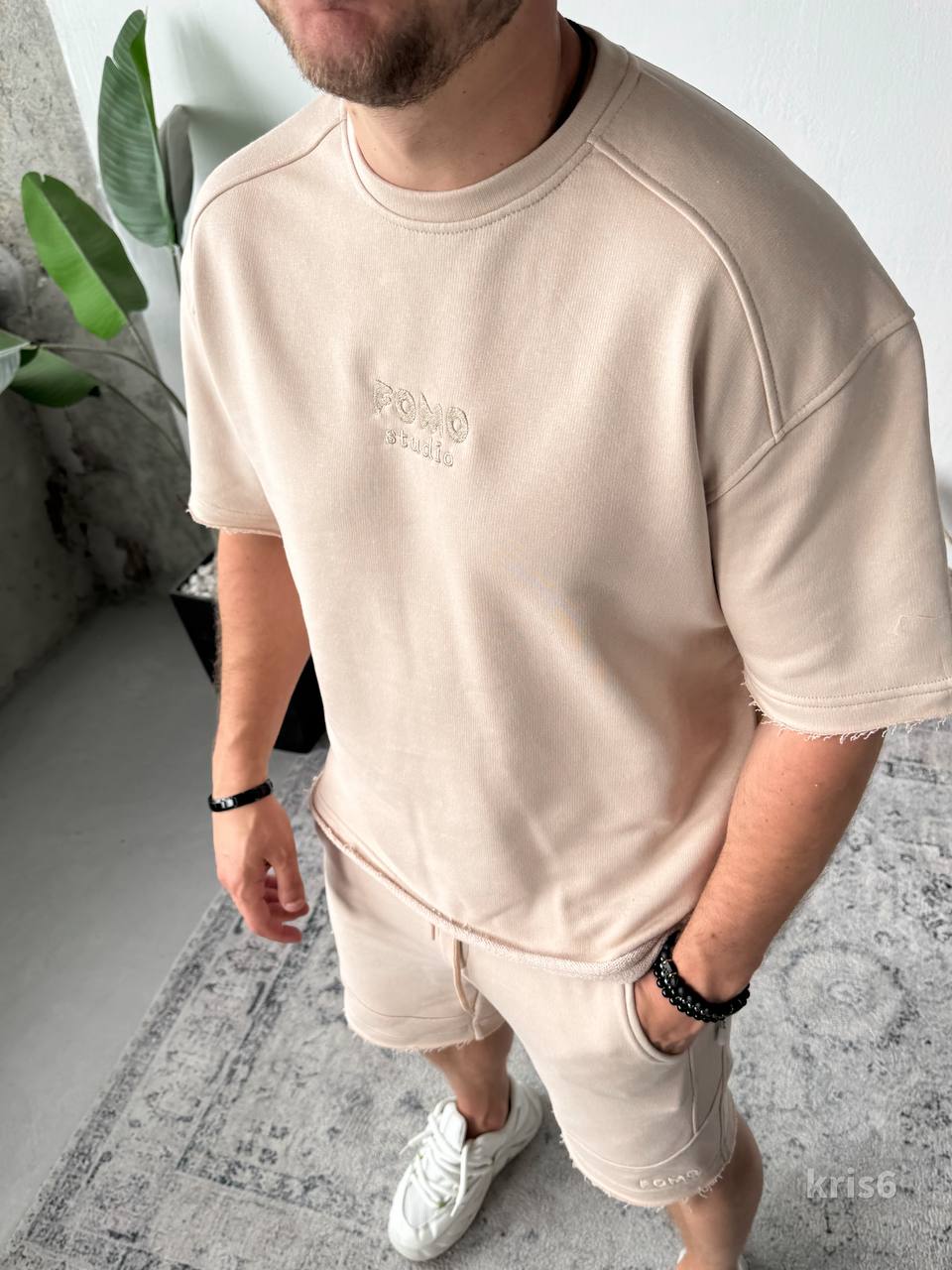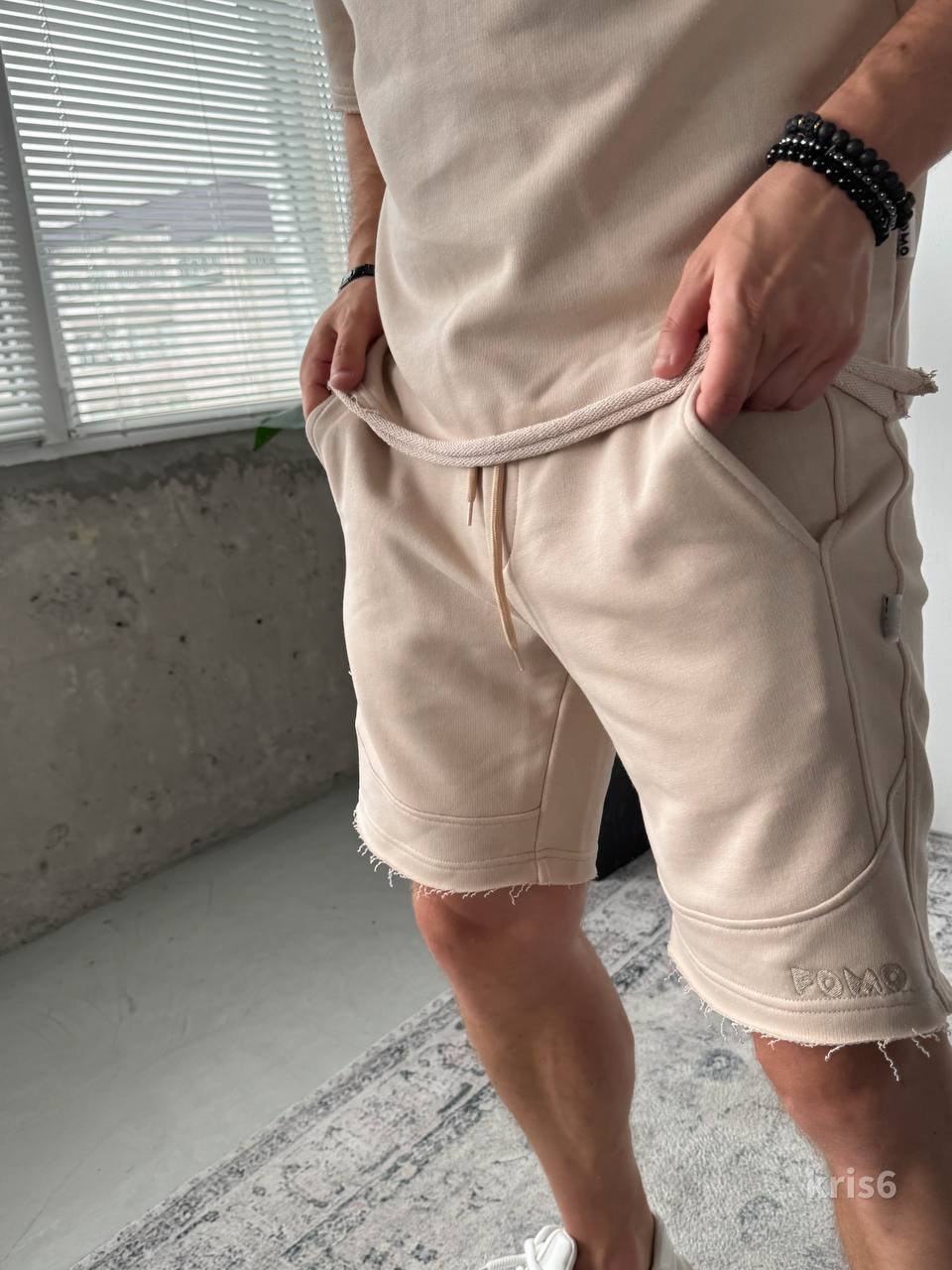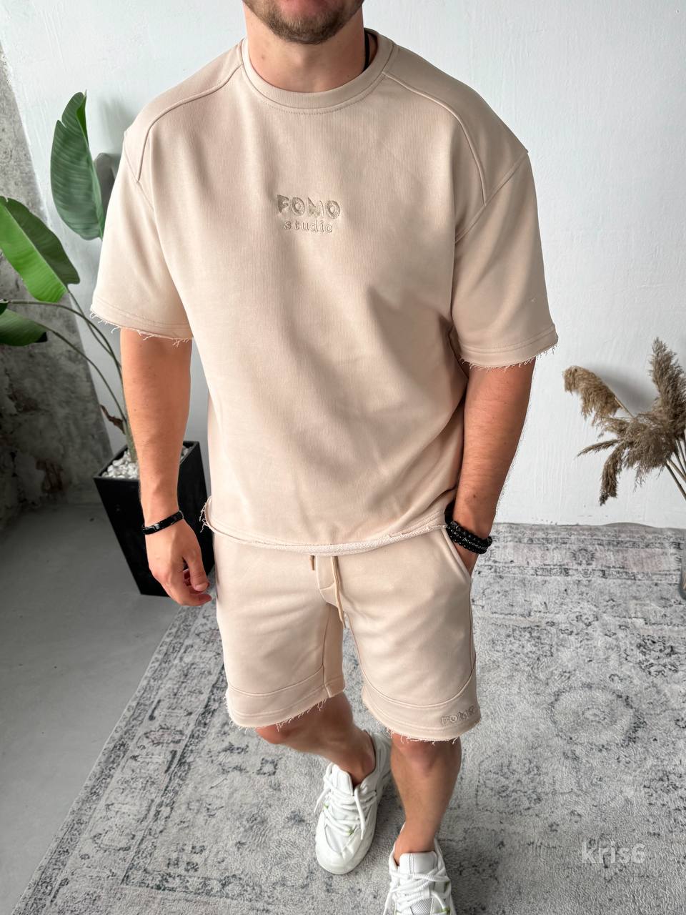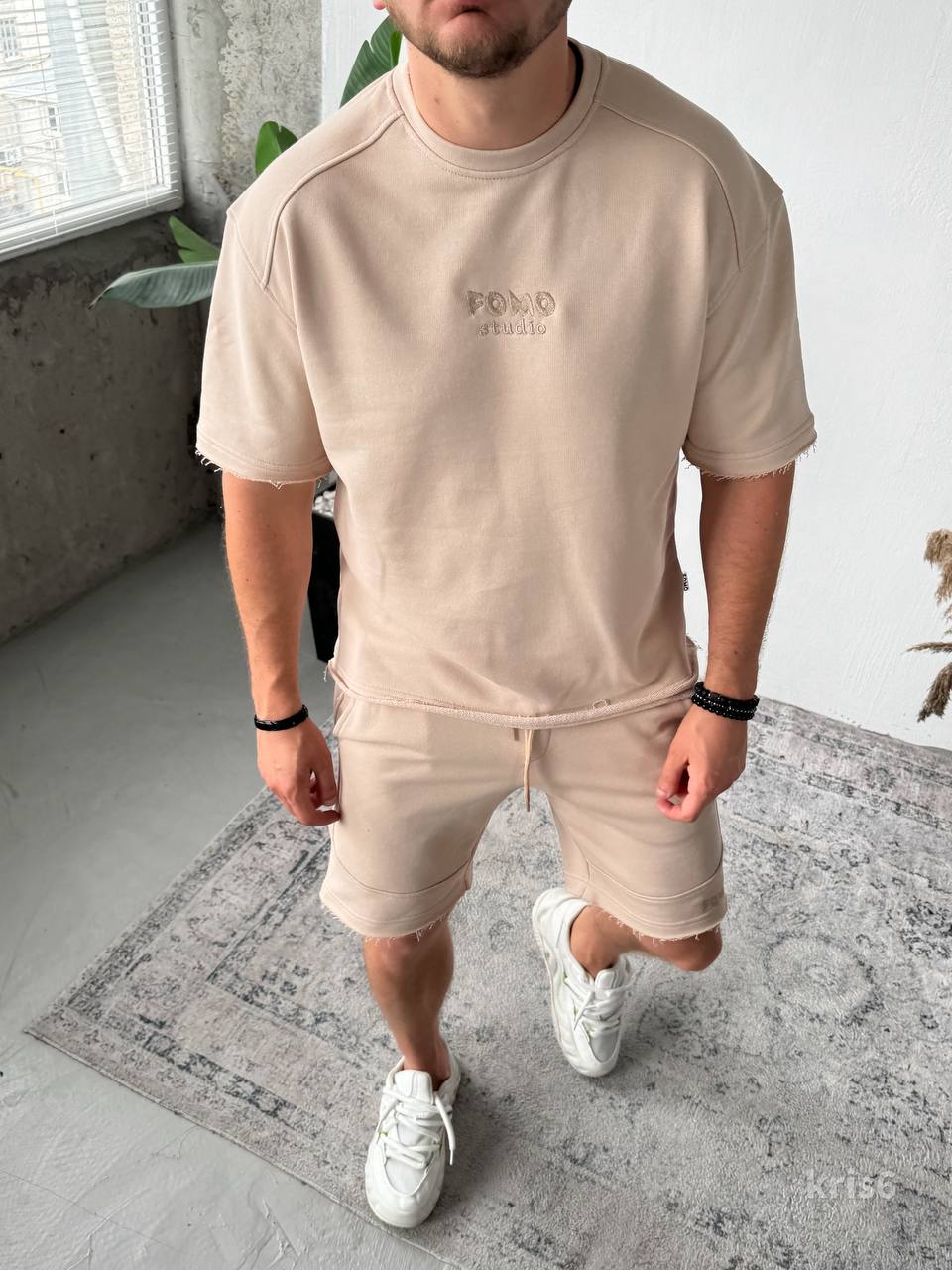 Чоловічий Бежевий Літній Костюм Футболка Шорти Вільного Крою з Необробленими Краями