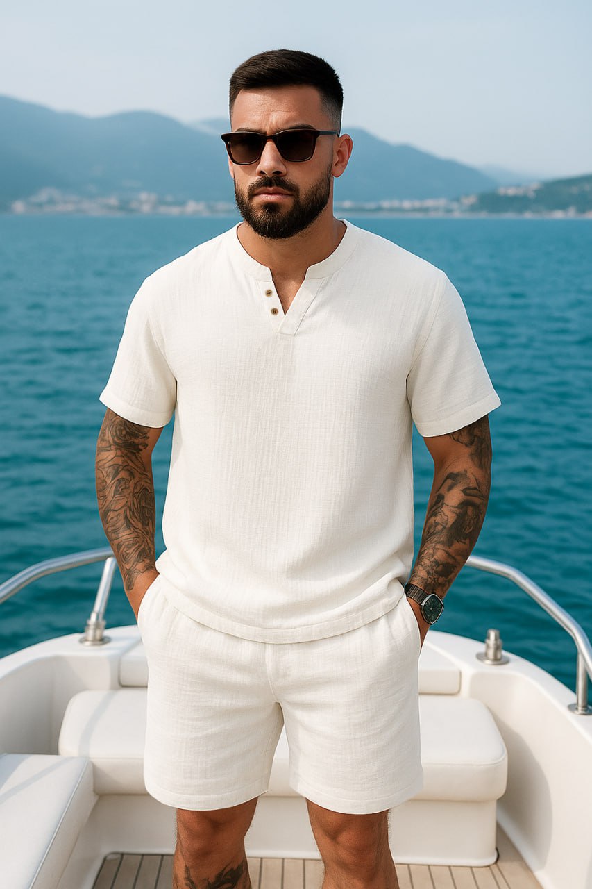 Чоловічий Білий Легкий Літній Мусліновий Костюм Комплект (Футболка + Шорти)