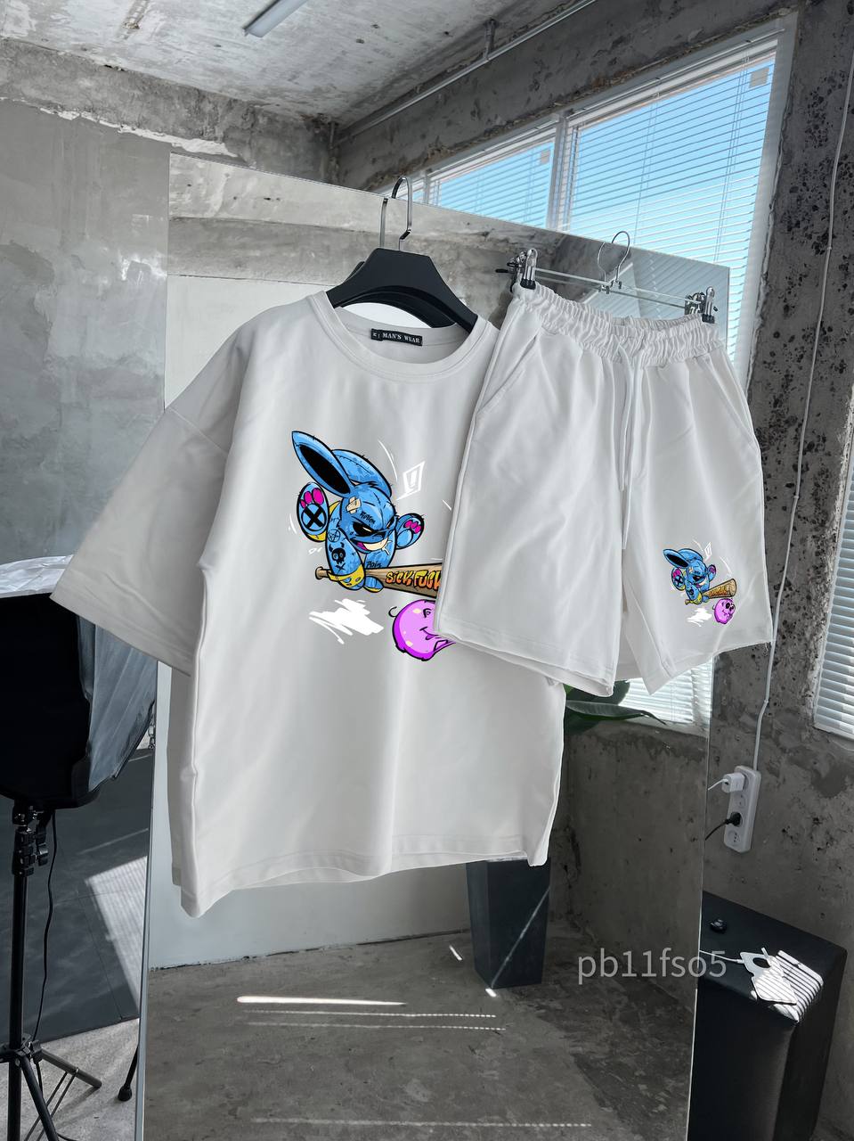 Чоловічий Білий Літній Комплект Футболка Шорти – Бавовняний з Принтом Заєць з Битою