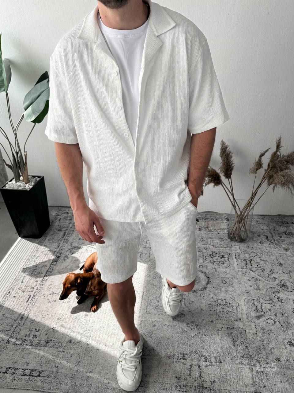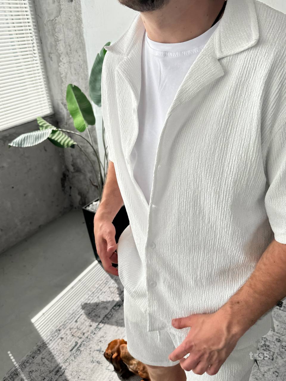 Чоловічий Білий Літній Костюм Сорочка Шорти Оверсайз із Фактурної Тканини