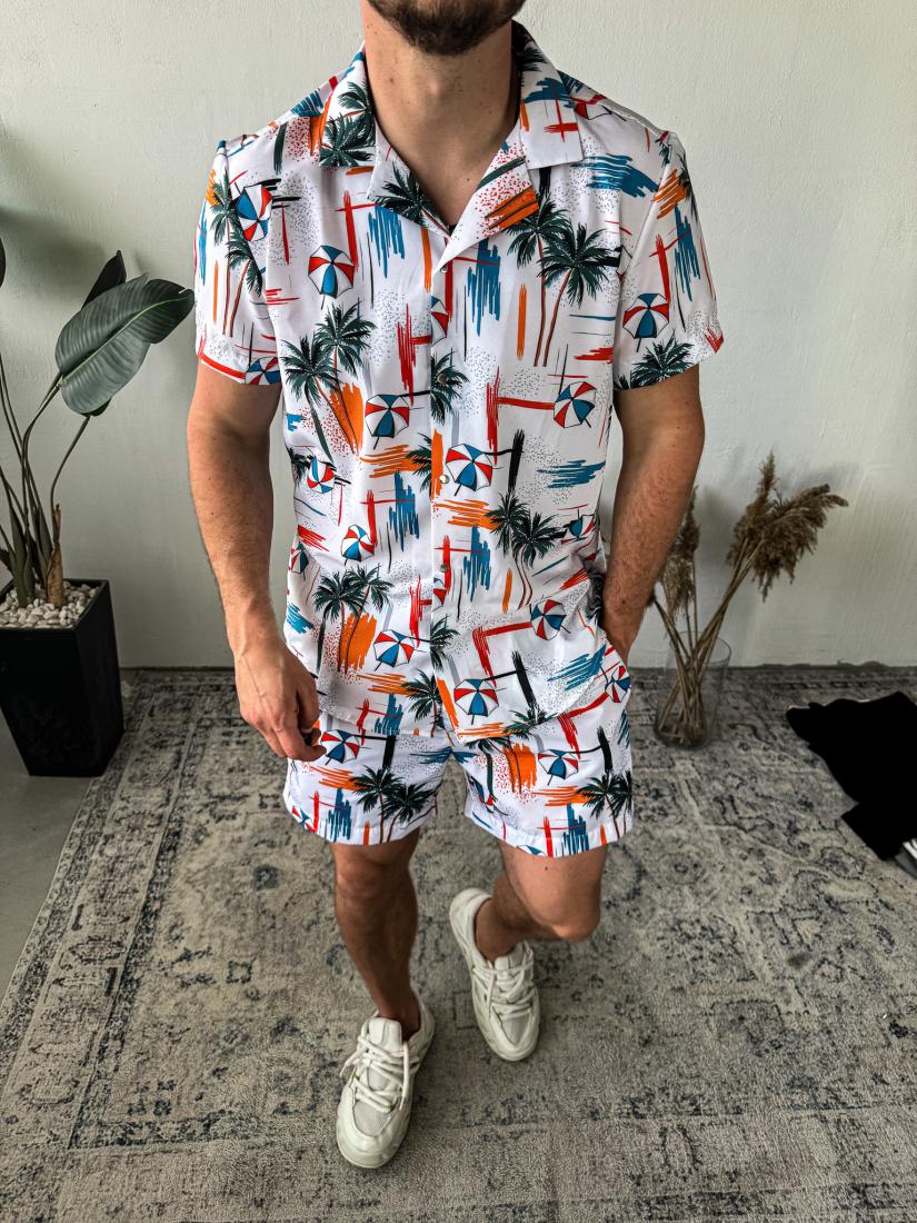 Чоловічий Білий Літній Пляжний Костюм Комплект з Пальмами – Сорочка Гавайка + Шорти