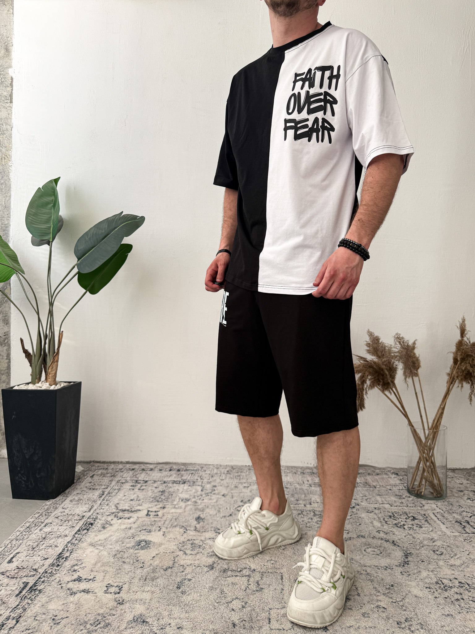 Чоловічий Чорно-Білий Костюм Оверсайз з Написом – Комплект Футболка Шорти