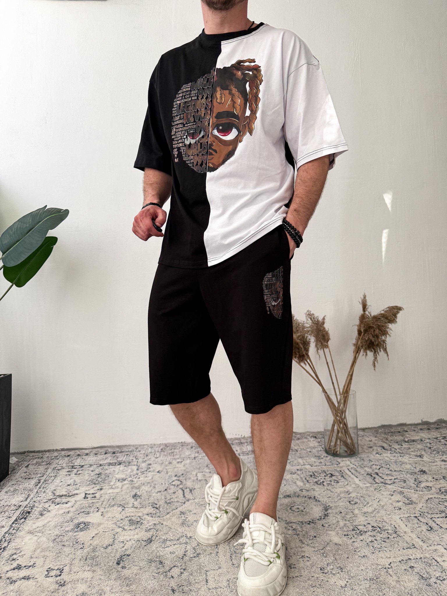 Чоловічий Чорно-Білий Костюм Оверсайз з Принтом – Комплект Футболка Шорти