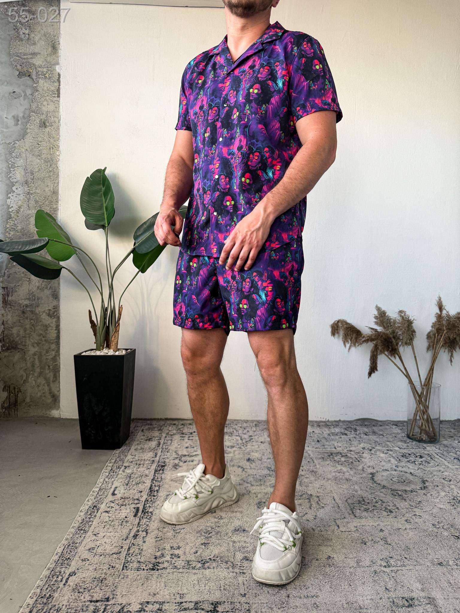 Чоловічий Фіолетовий Літній Пляжний Костюм Комплект в Принт – Сорочка Гавайка + Шорти