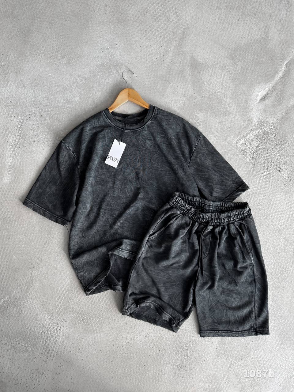 Чоловічий Графітовий Літній Костюм Футболка Шорти Варьонки з Потертостями по Краях
