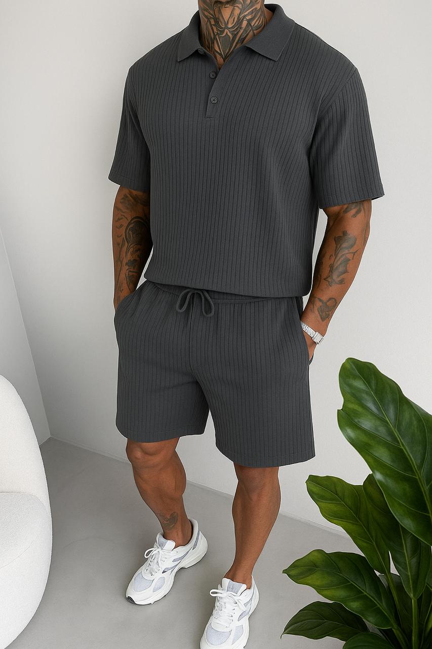 Чоловічий Графітовий Літній Костюм у Широкий Рубчик – Футболка Поло + Шорти