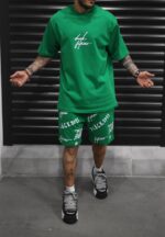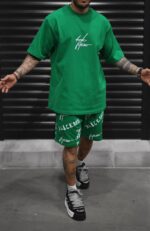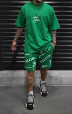 Чоловічий Літній бавовняний зелений комплект Оверсайз з написами (Футболка + Шорти)