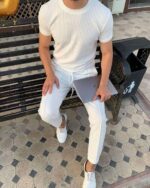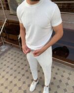 Чоловічий Літній Білий Костюм із Фактурної Тканини – Комплект Футболка + Штани зі Стрілками