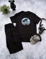 Чоловічий Літній Чорний Костюм Двійка з Принтом Пальмами на Спині – Футболка + Шорти