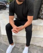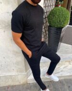 Чоловічий Літній Чорний Костюм із Фактурної Тканини – Комплект Футболка + Штани зі Стрілками