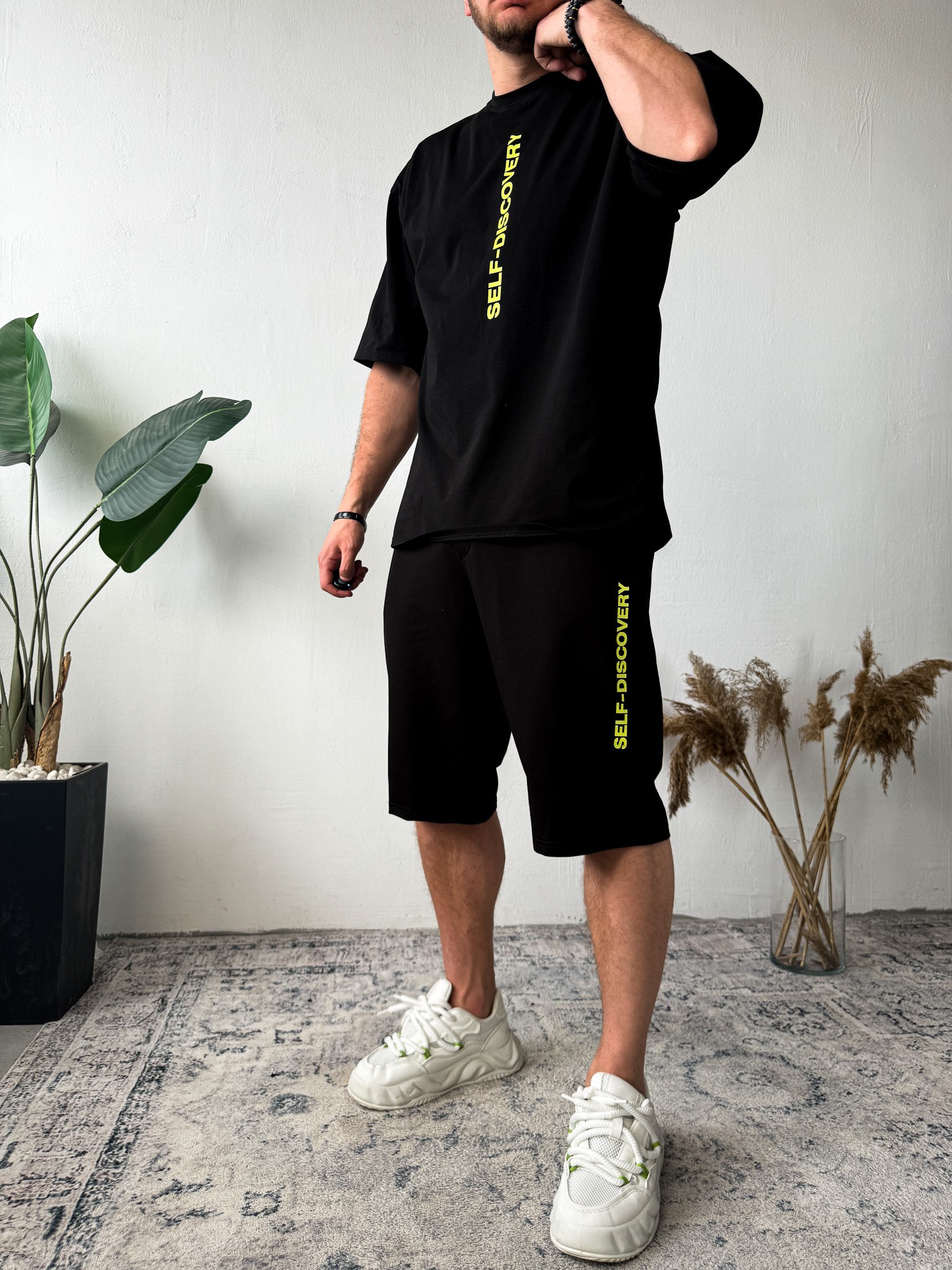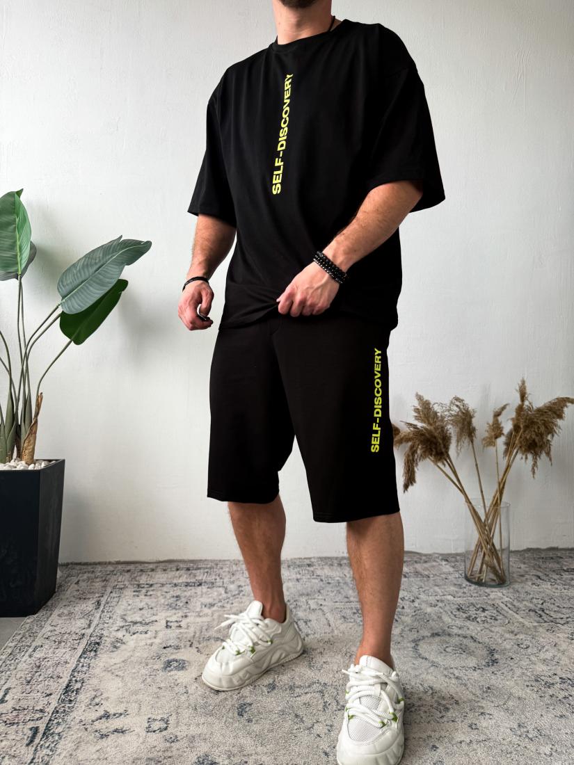 Чоловічий Літній Чорний Костюм Комплект Оверсайз з Написами (Футболка + Шорти)