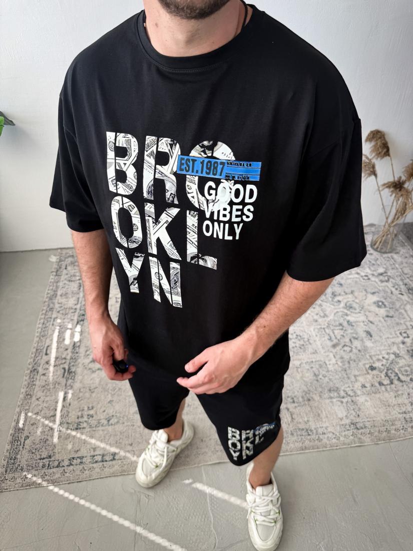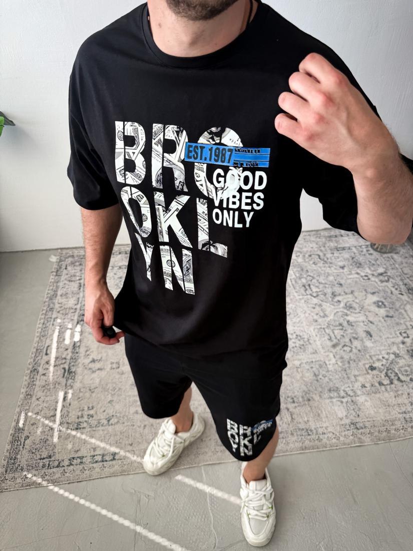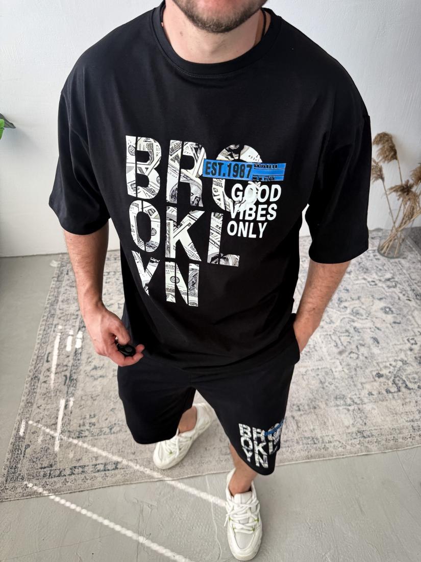 Чоловічий Літній Чорний Костюм Комплект Оверсайз з Принтом Написом (Футболка + Шорти)