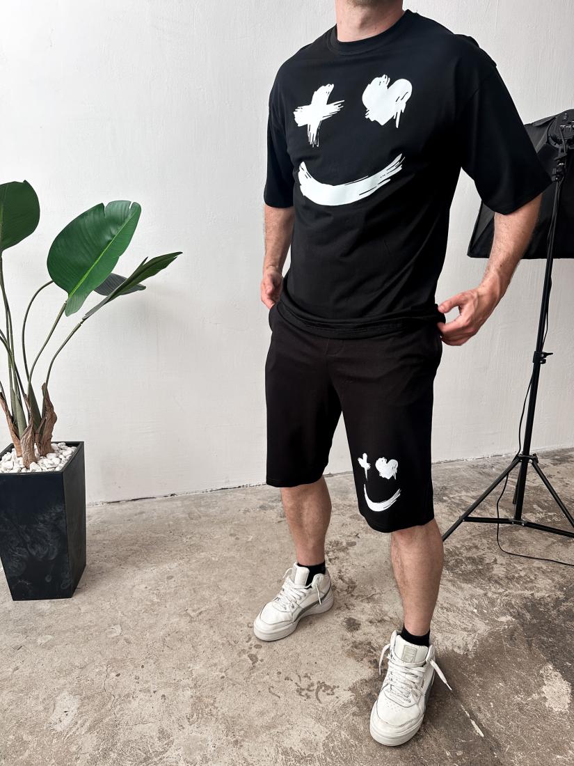 Чоловічий Літній Чорний Костюм Комплект Оверсайз з Принтом Посмішка (Футболка + Шорти)