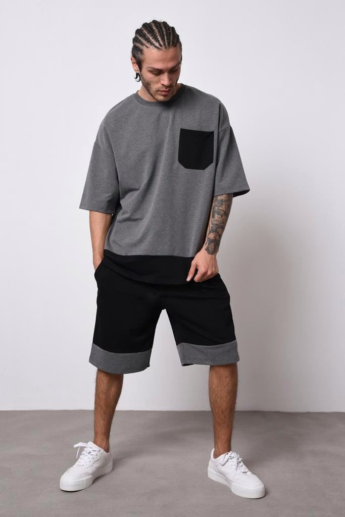 Чоловічий Літній Костюм Сірий Чорний- Вільного Крою Бавовна Шорти+Футболка Оверсайз Двоколірний