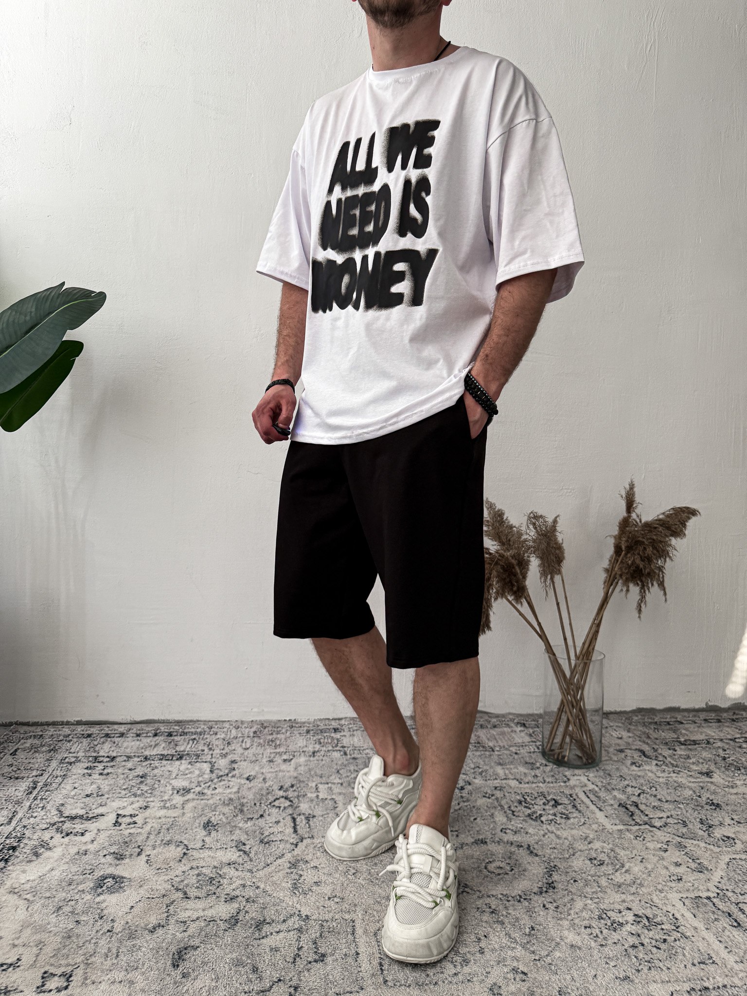Чоловічий Літній Костюм з Написом – Оверсайз Комплект Біла Футболка та Чорні Шорти
