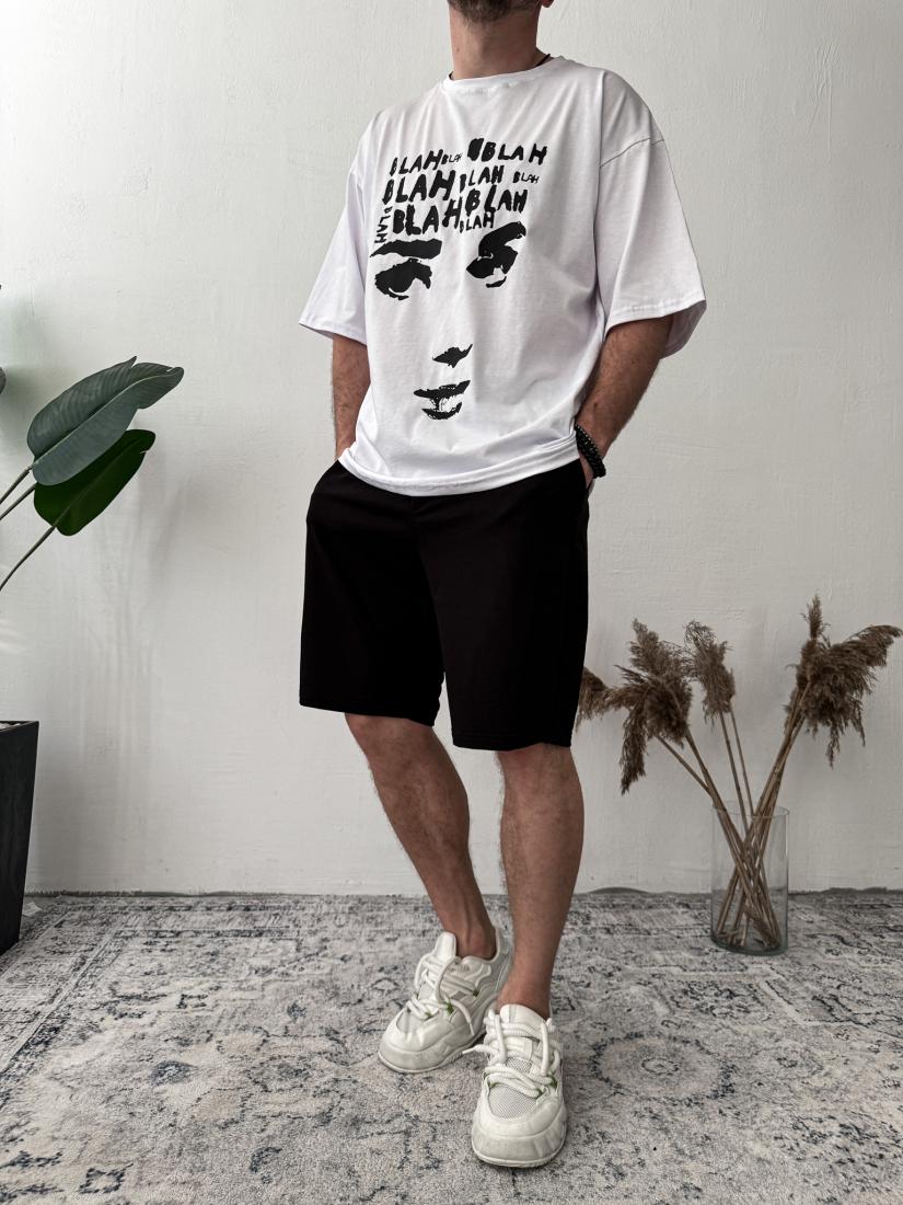 Чоловічий Літній Костюм з Принтом Обличчя – Оверсайз Комплект Біла Футболка та Чорні Шорти