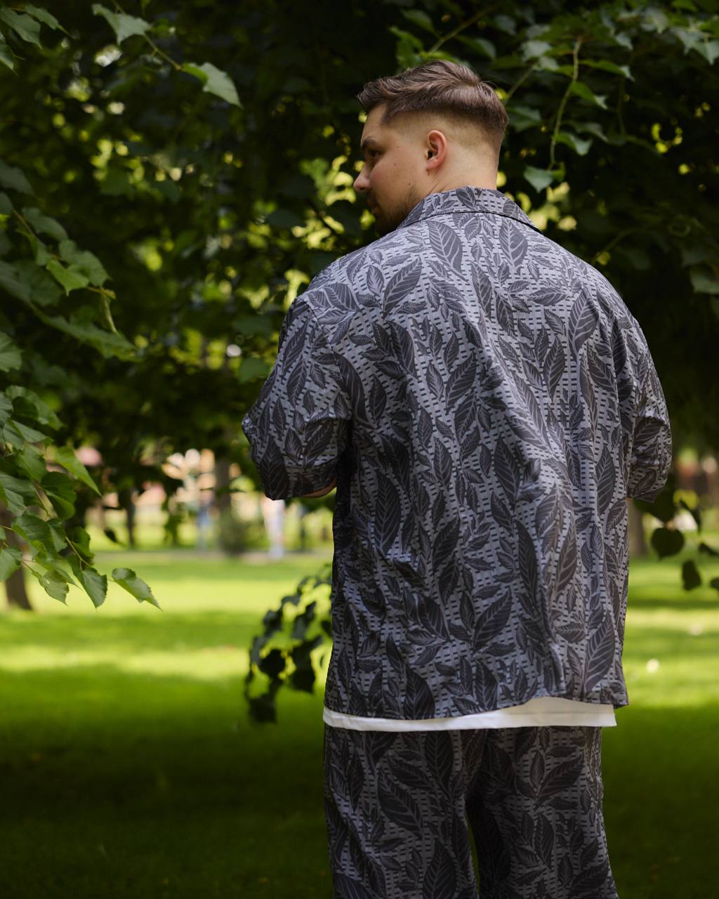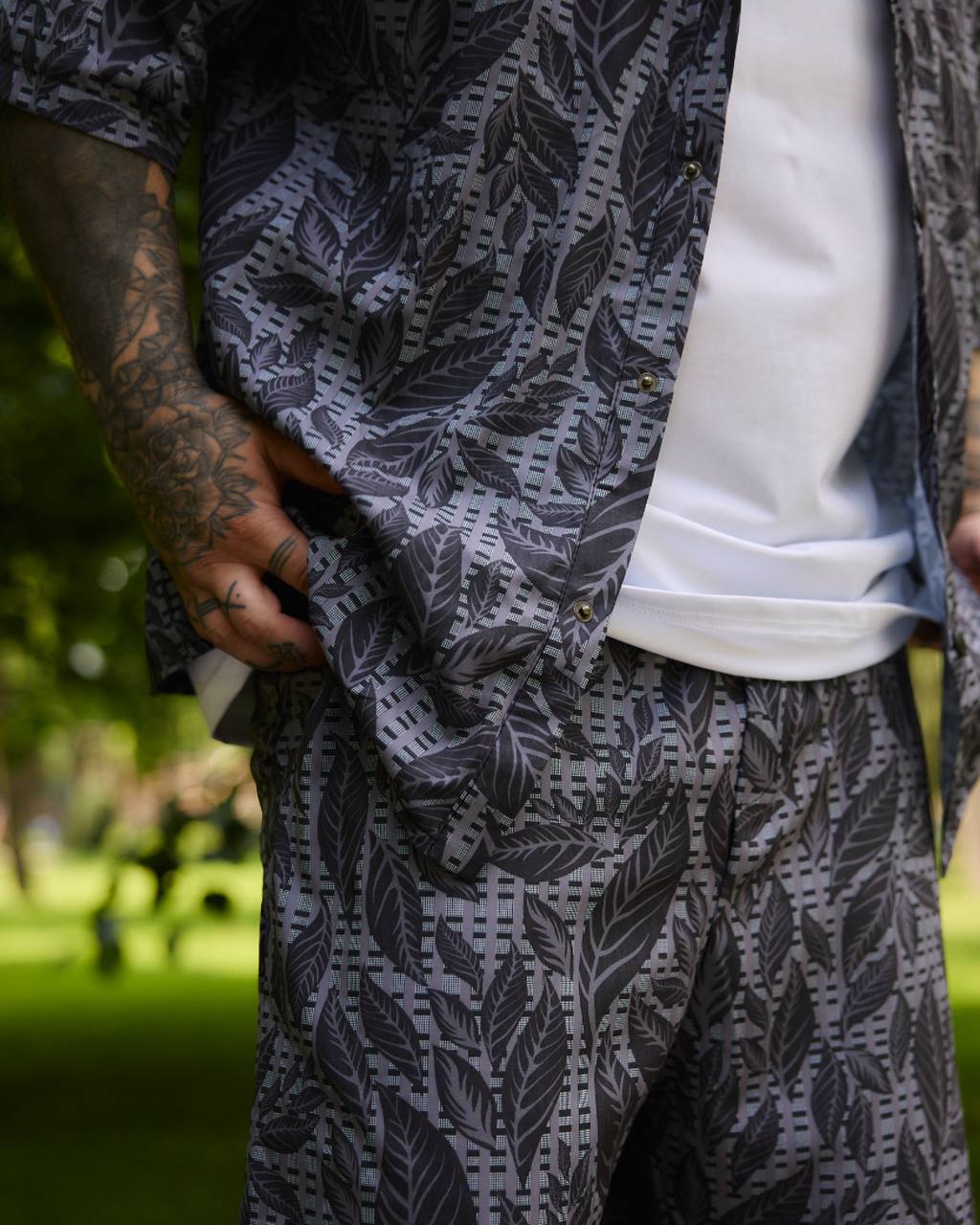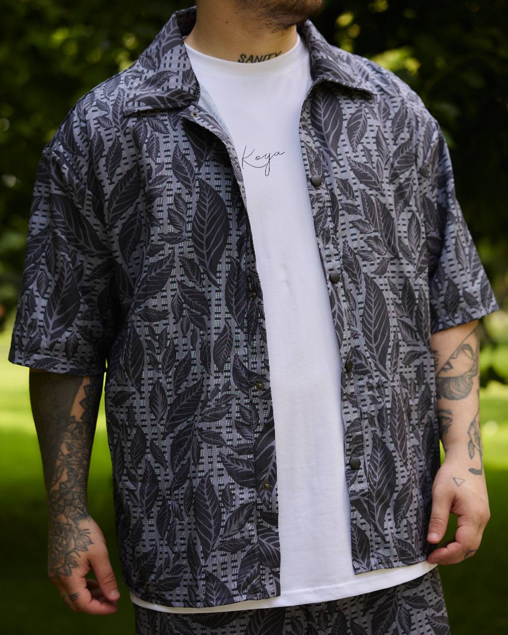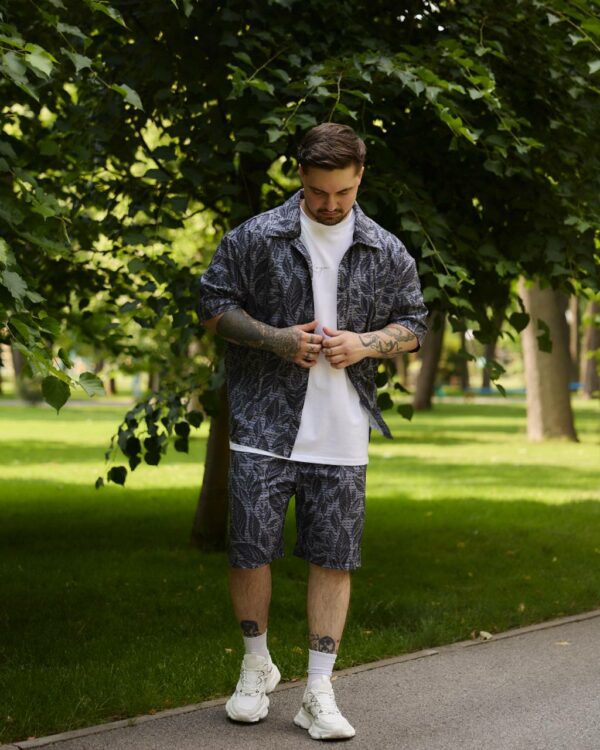 Чоловічий Літній Сірий Комплект Сорочка Шорти Оверсайз в Принт Листя