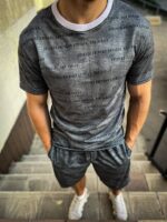 Чоловічий Літній Сірий Костюм Двійка – Графітовий з Принтом “Російський військовий корабель” (Футболка + Шорти)