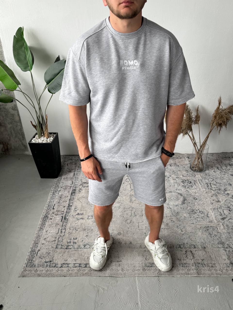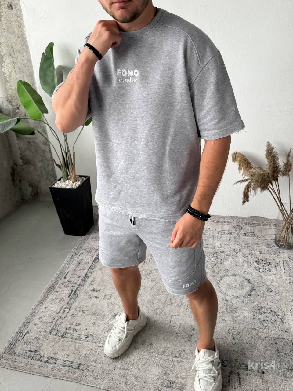 Чоловічий Літній Сірий Меланж Костюм Футболка Шорти Вільного Крою з Необробленими Краями
