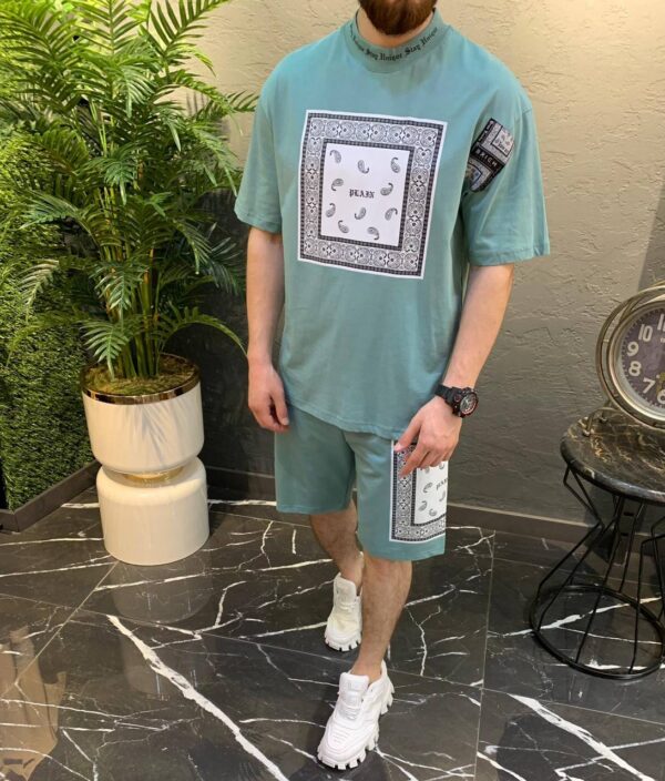 Чоловічий М’ятний Літній Комплект Вільний Оверсайз з Візерунками Принтами – Шорти + Футболка