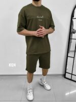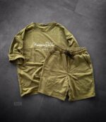 Чоловічий Вільний Літній Комплект Хакі Оверсайз зі Швами Спереду Футболка + Шорти