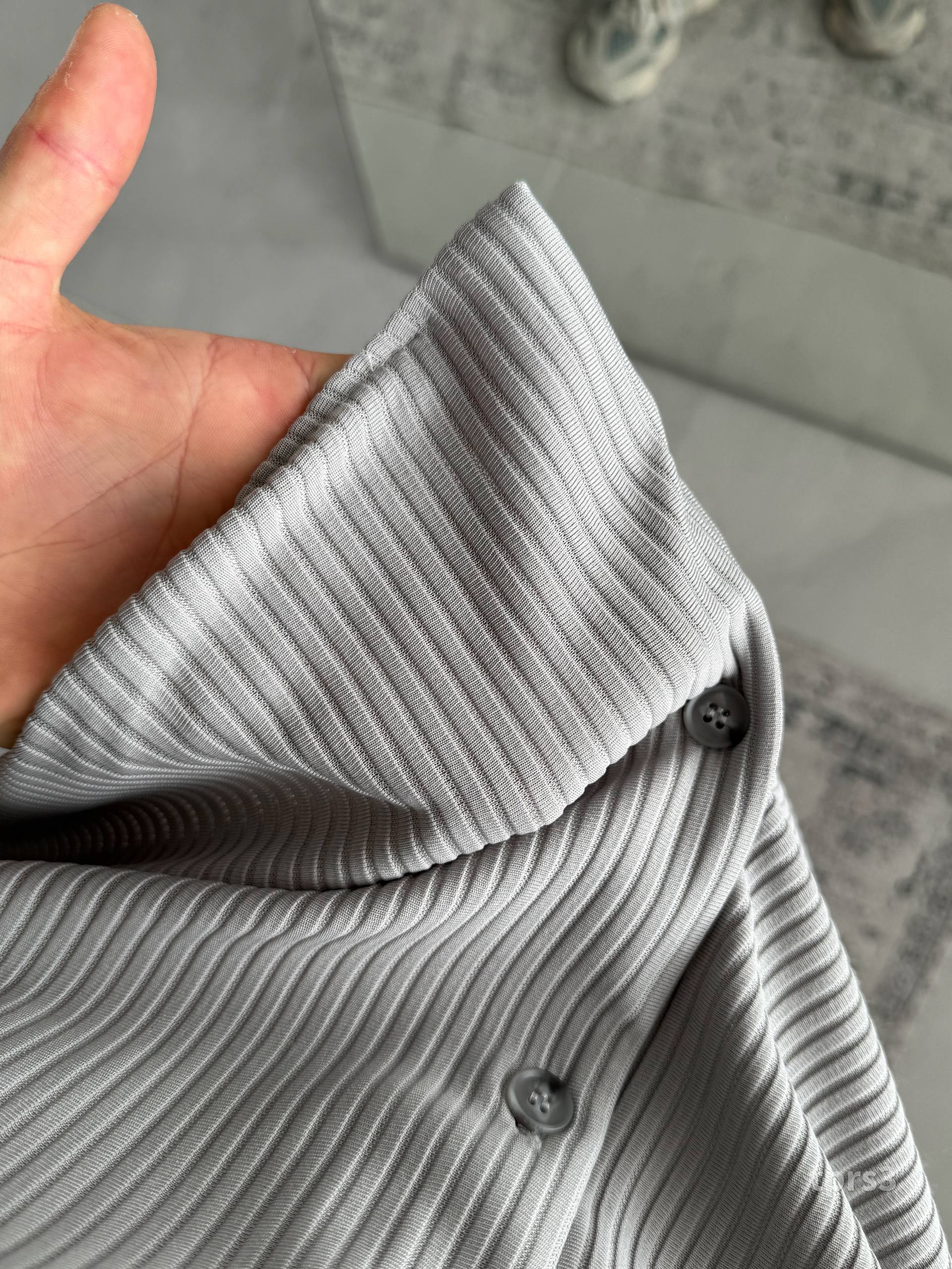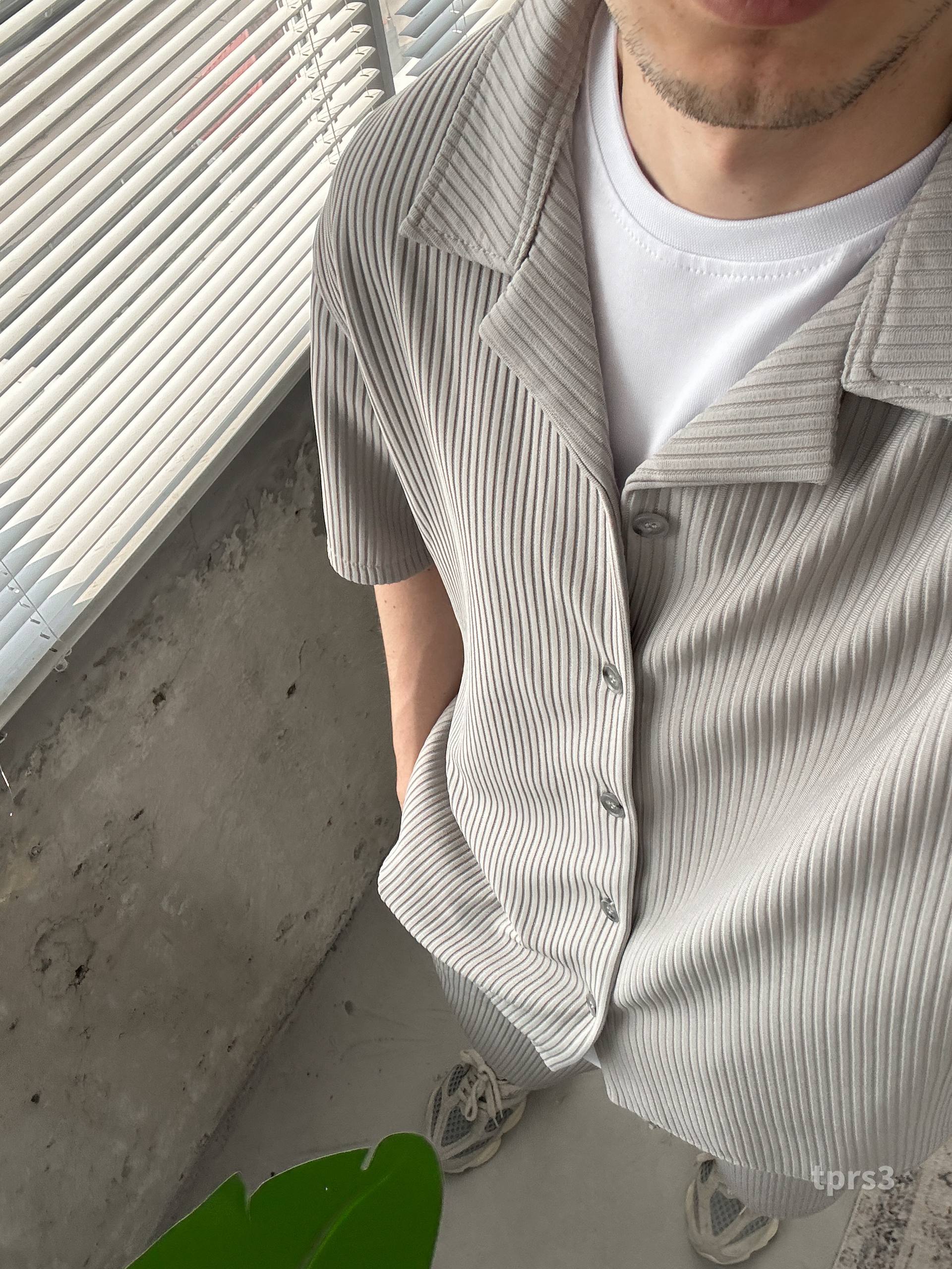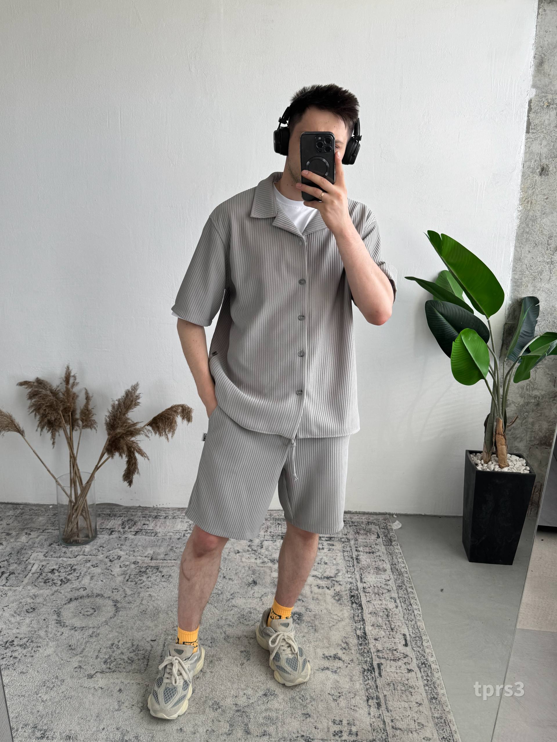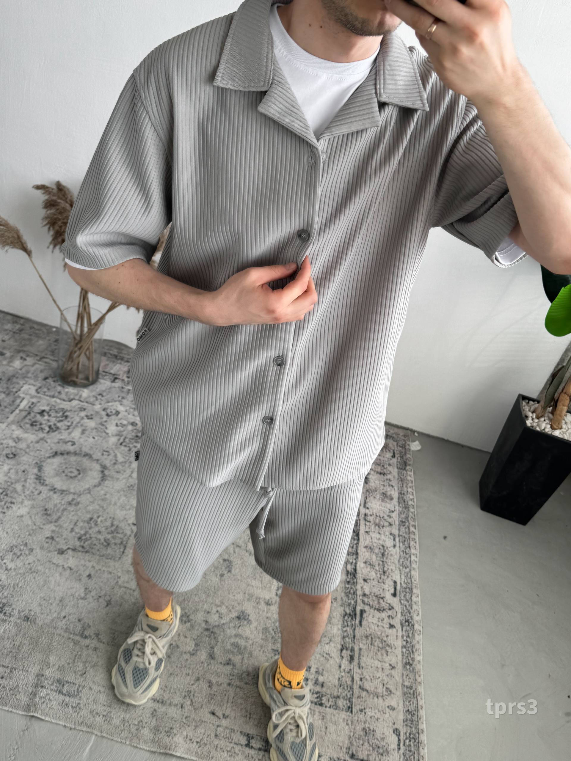 Чоловічий Вільний Літній Сірий Костюм Сорочка Шорти в Рубчик