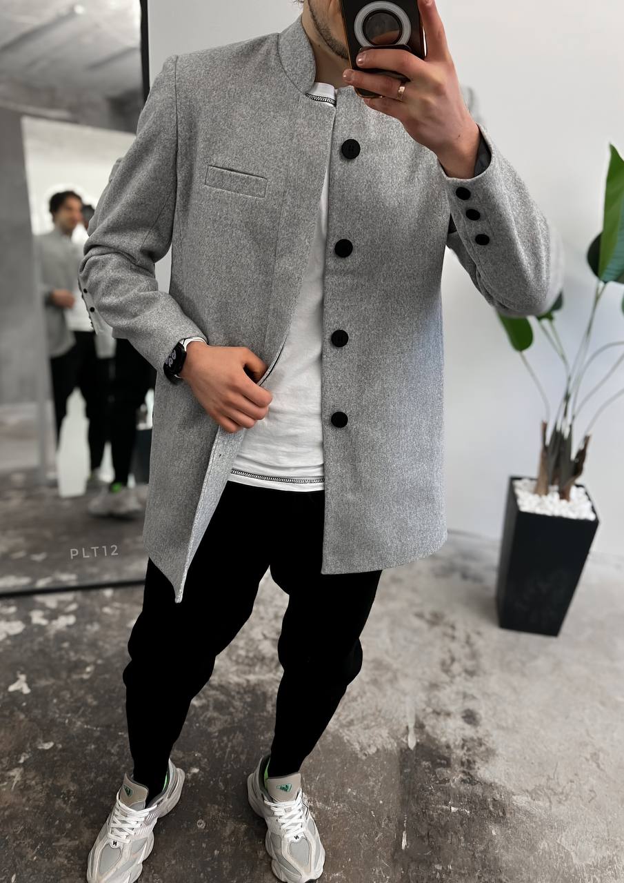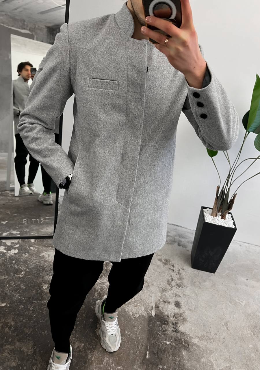 Чоловіче Демісезонне Сіре Пальто – Коротке Класичне з Коміром Стійкою
