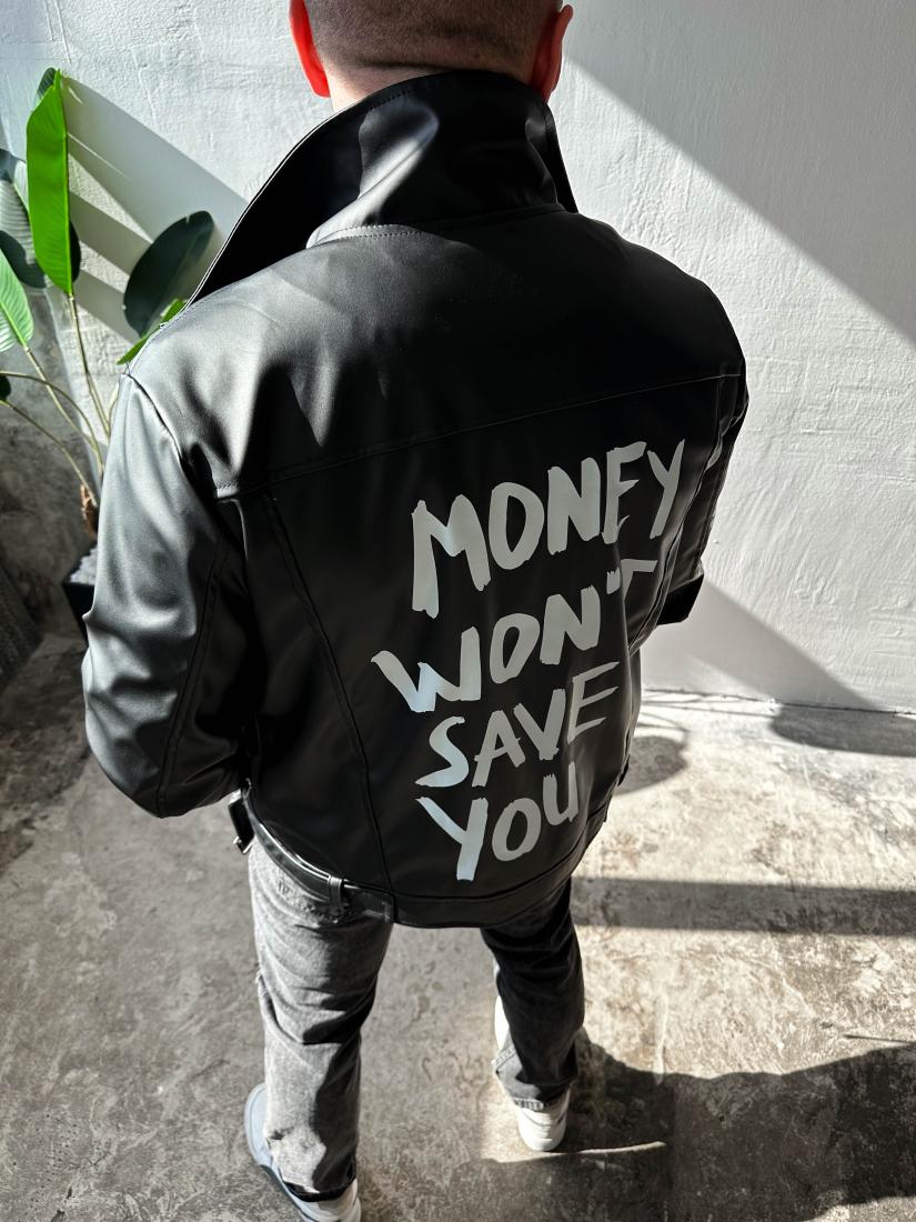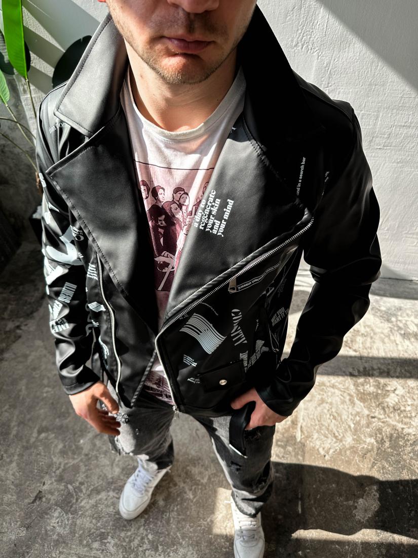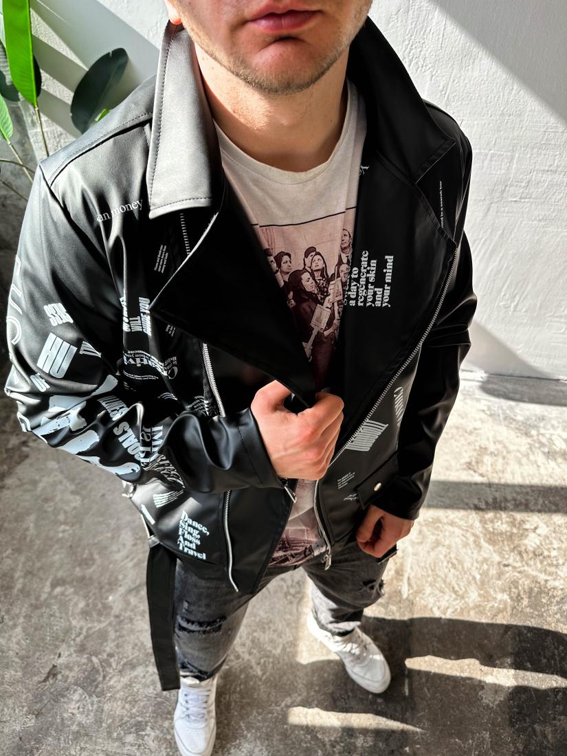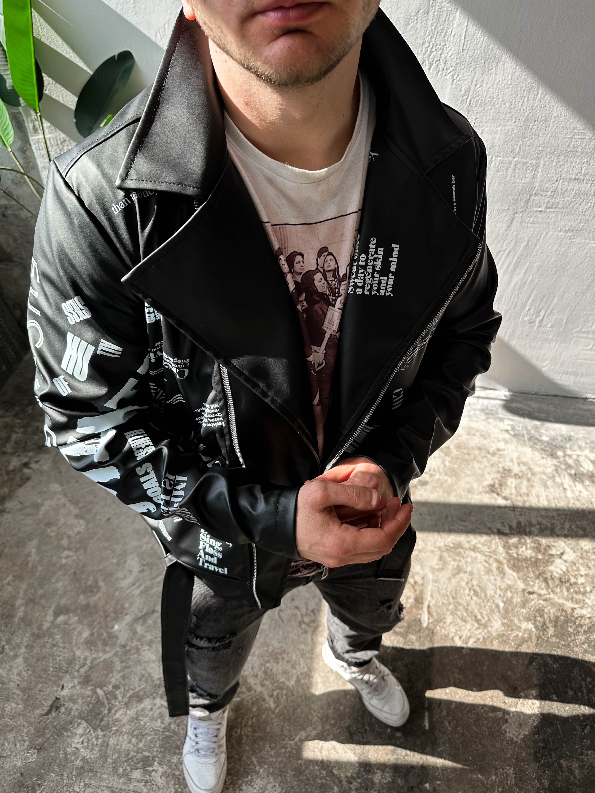 Чоловіча Чорна Шкіряна Куртка Косуха у Написах з Поясом