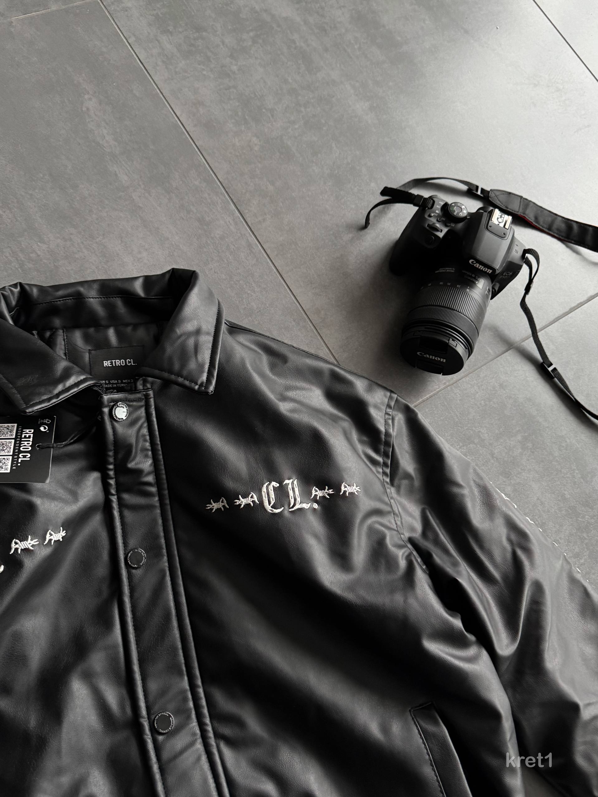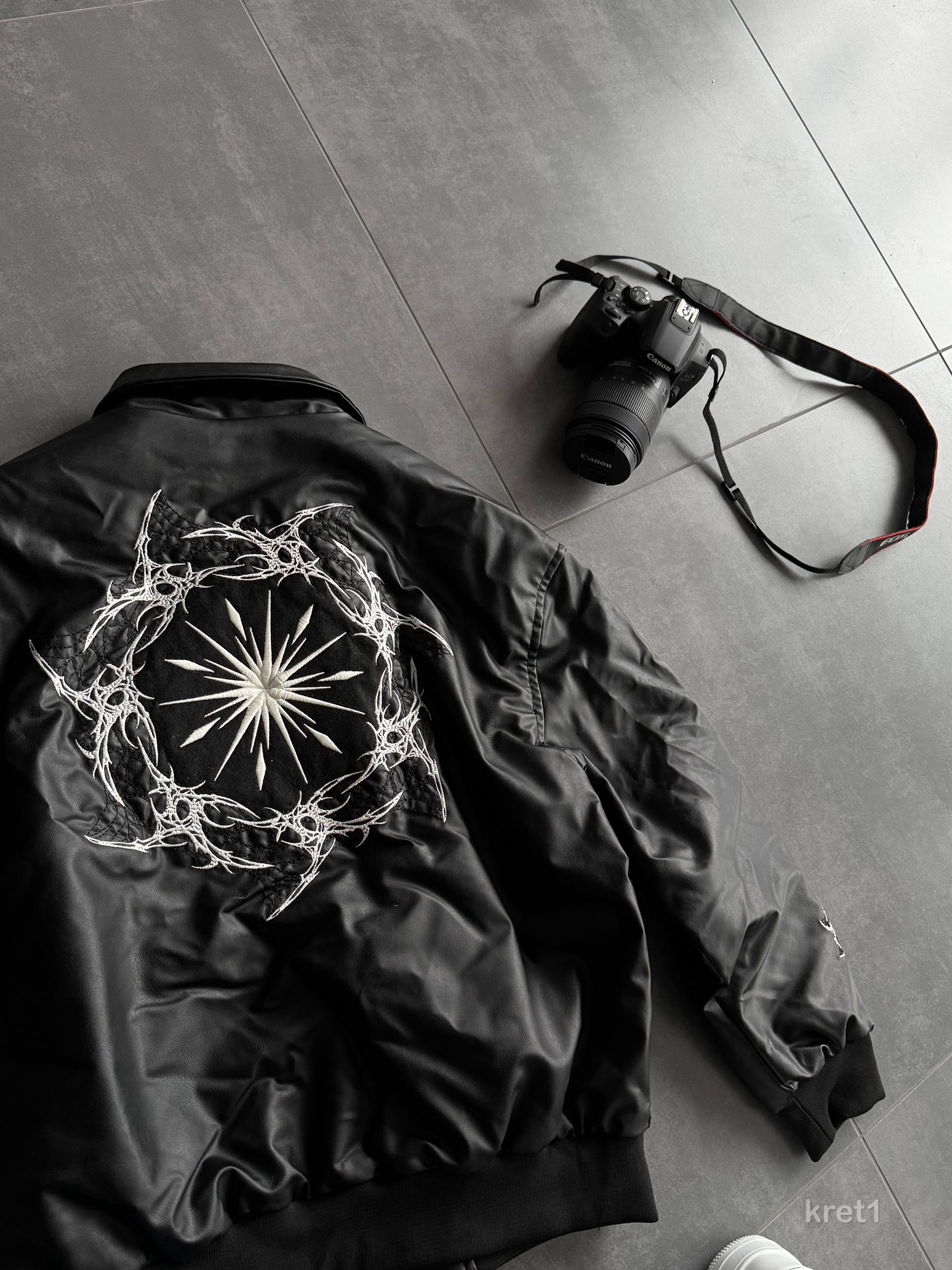 Чоловіча Демісезонна Чорна Шкіряна Куртка Бомбер з Вишивками