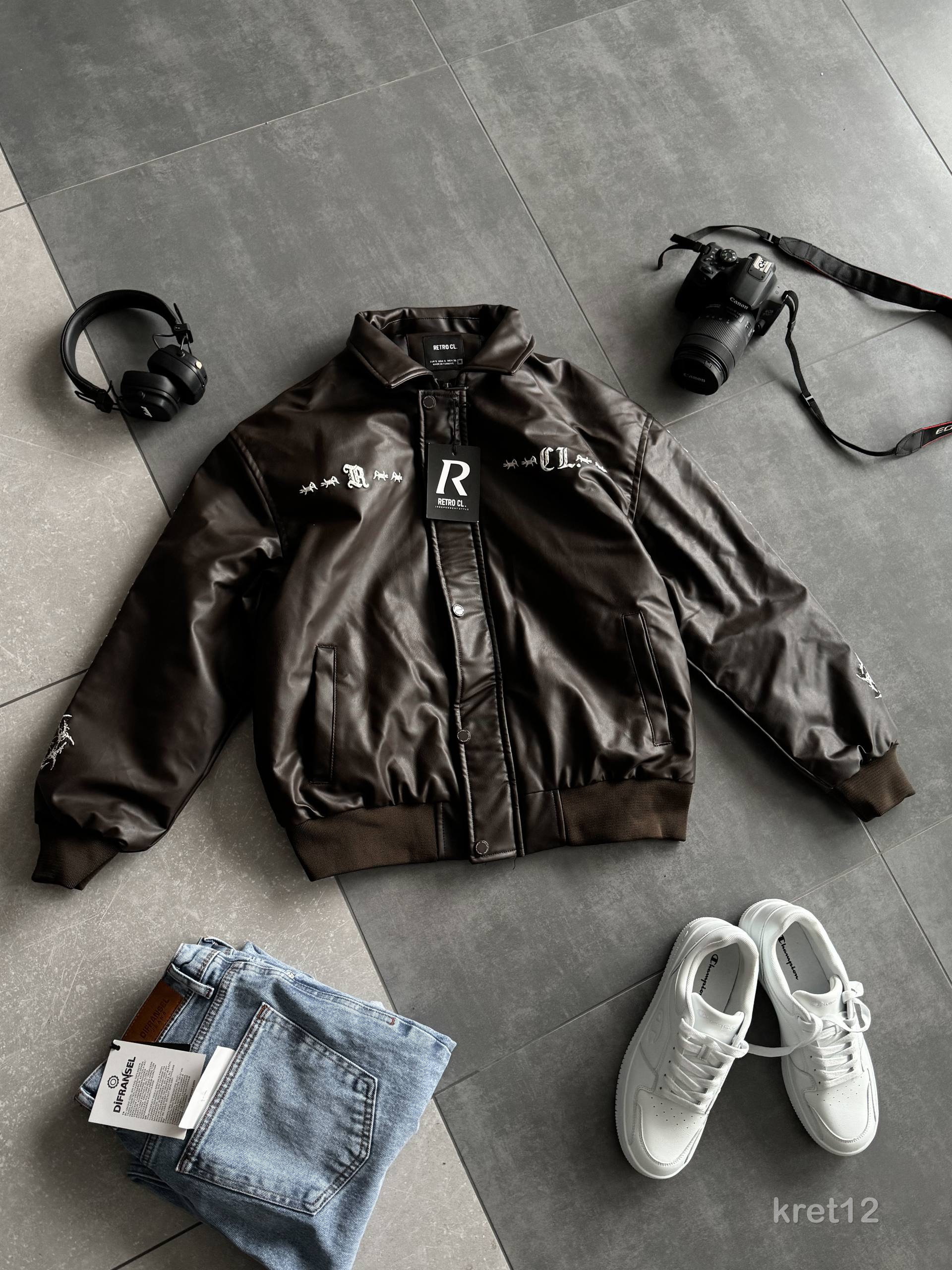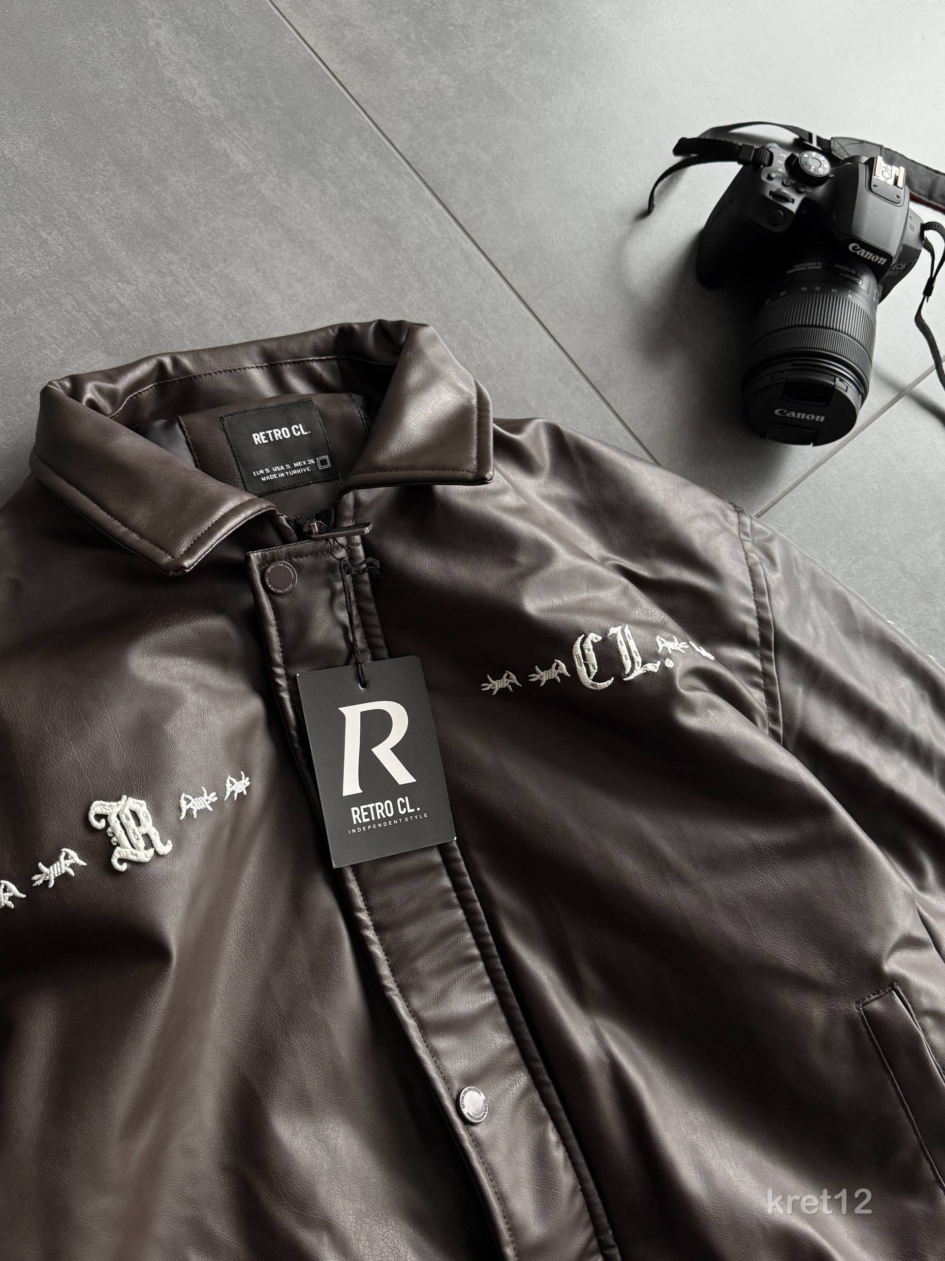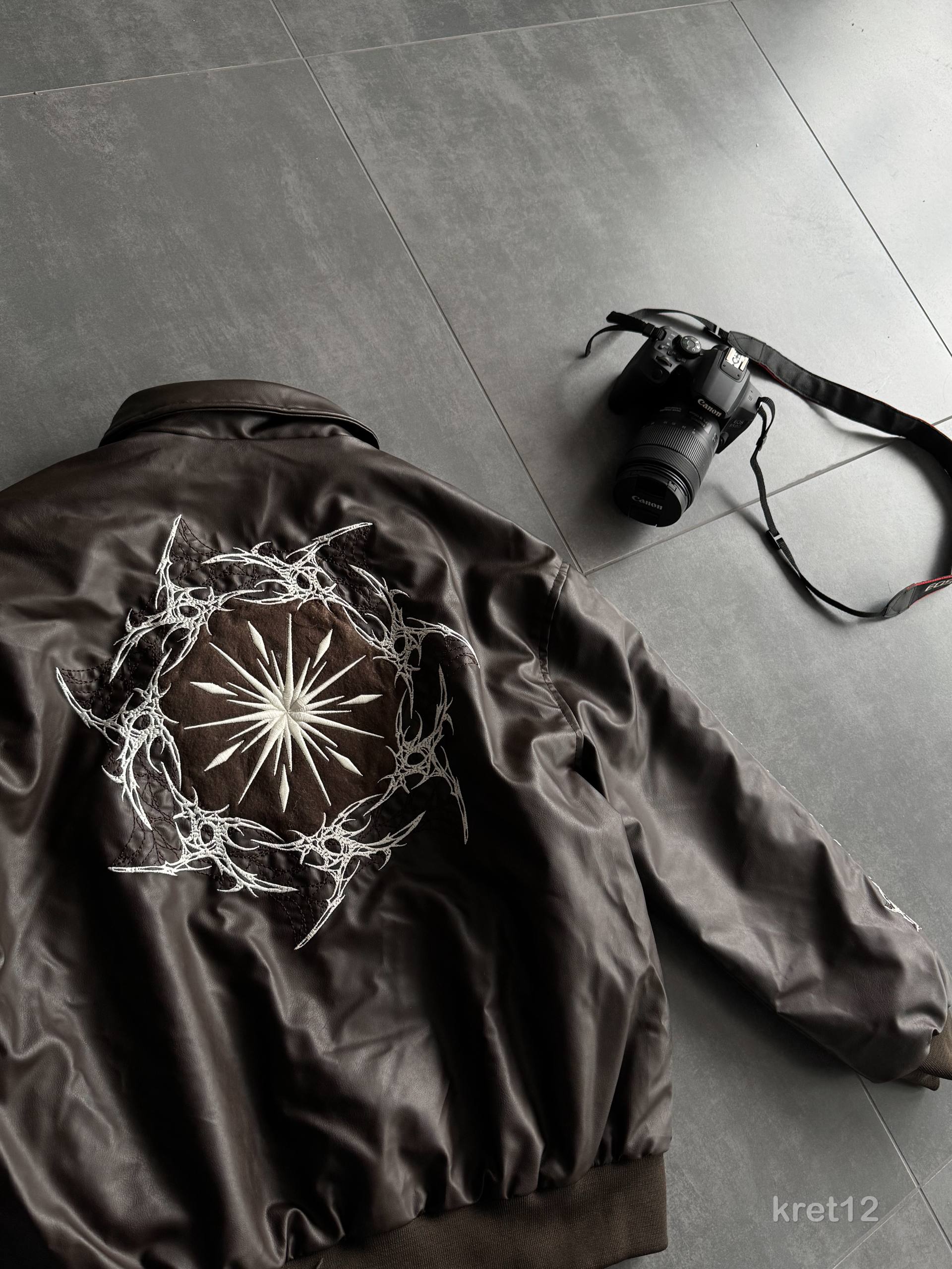 Чоловіча Демісезонна Коричнева Шкіряна Куртка Бомбер з Вишивками