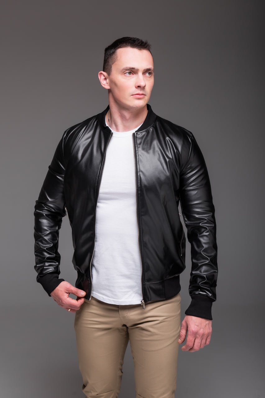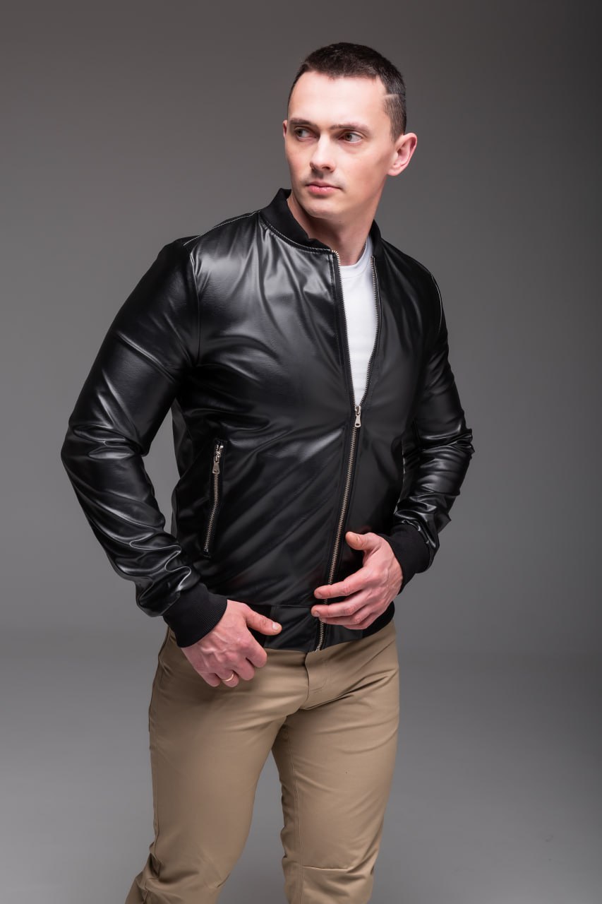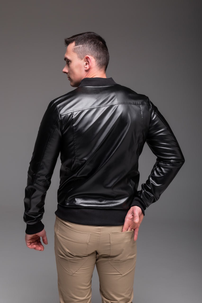 Чоловіча Чорна Кожана Куртка-бомбер на Замку з Манжетами