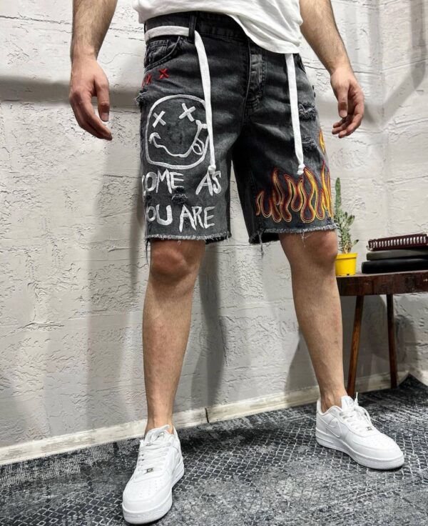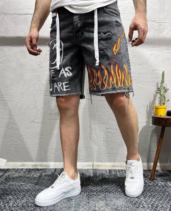 Чоловічі Темно-Сірі Джинсові Шорти Рвані – Літні з Вишитими Принтами на Шнурку