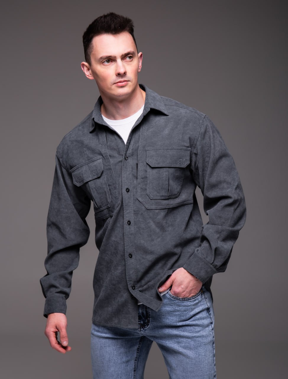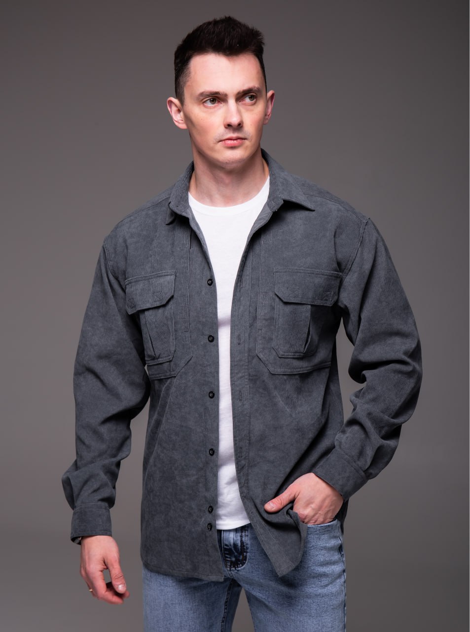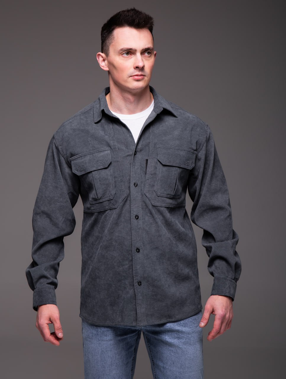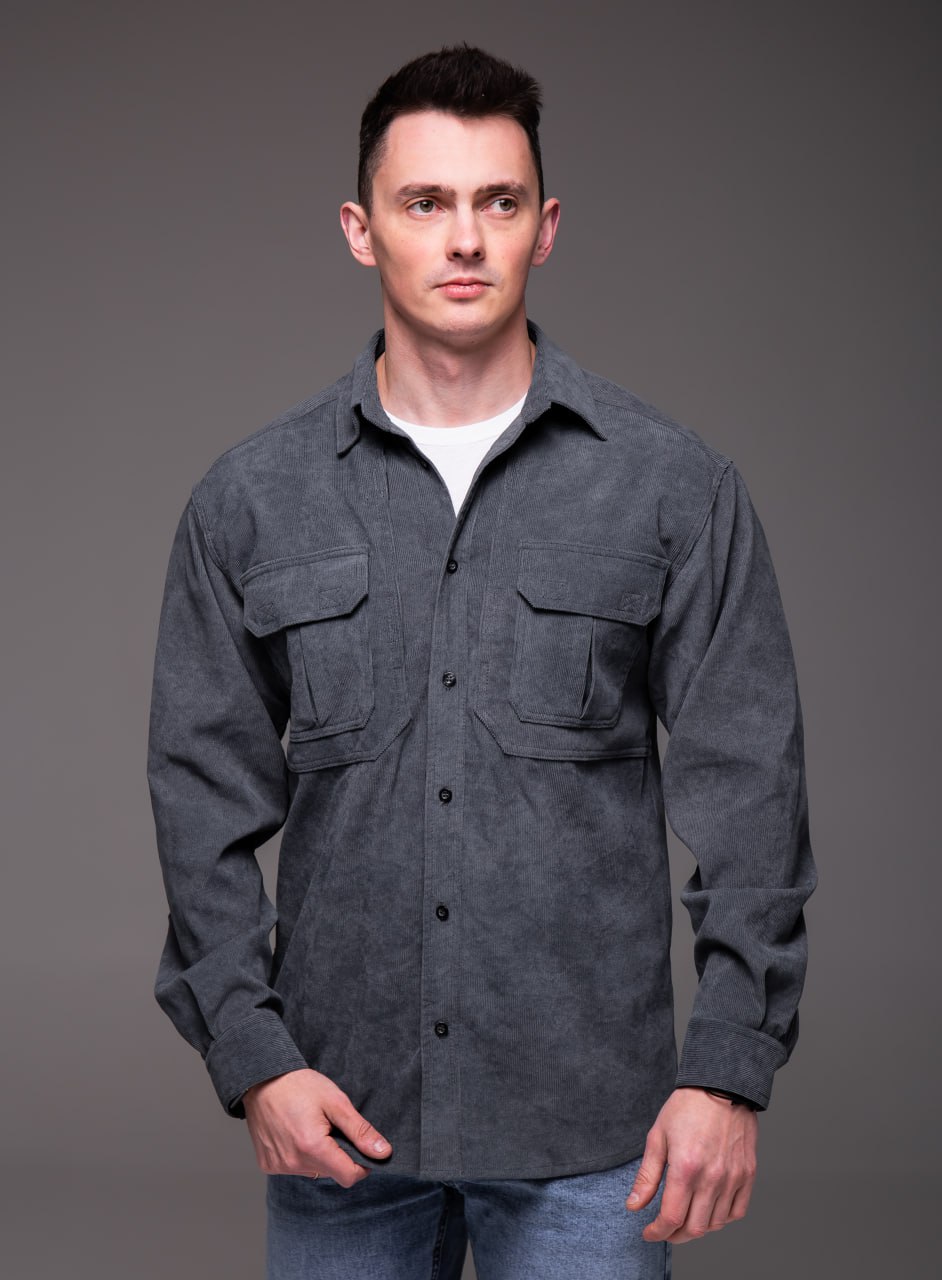 Чоловіча Базова Графітова Вельветова Сорочка Оверсайз з Накладними Кишенями