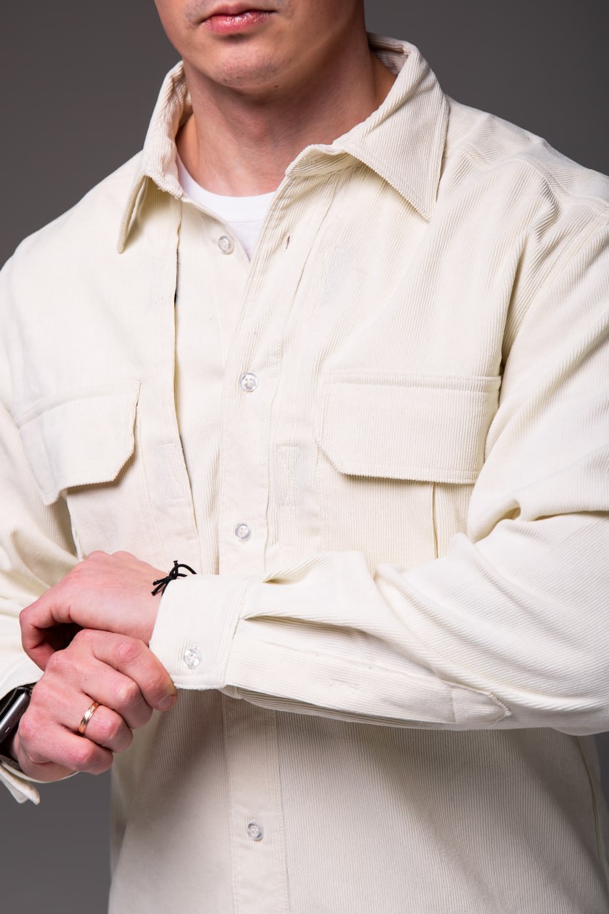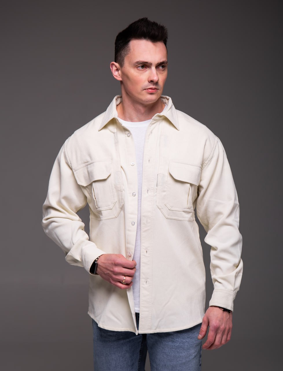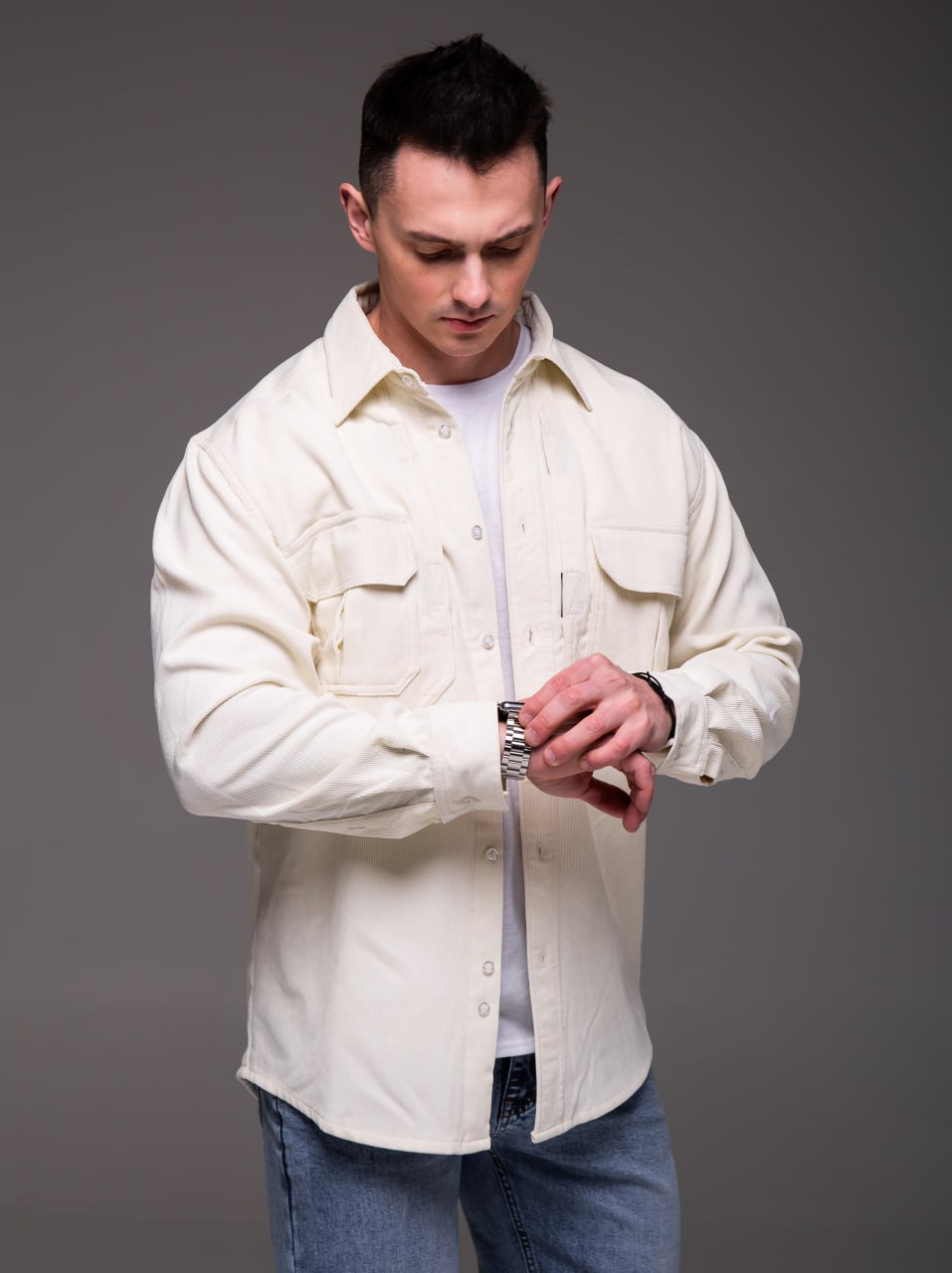 Чоловіча Базова Молочна Вельветова Сорочка Оверсайз з Накладними Кишенями