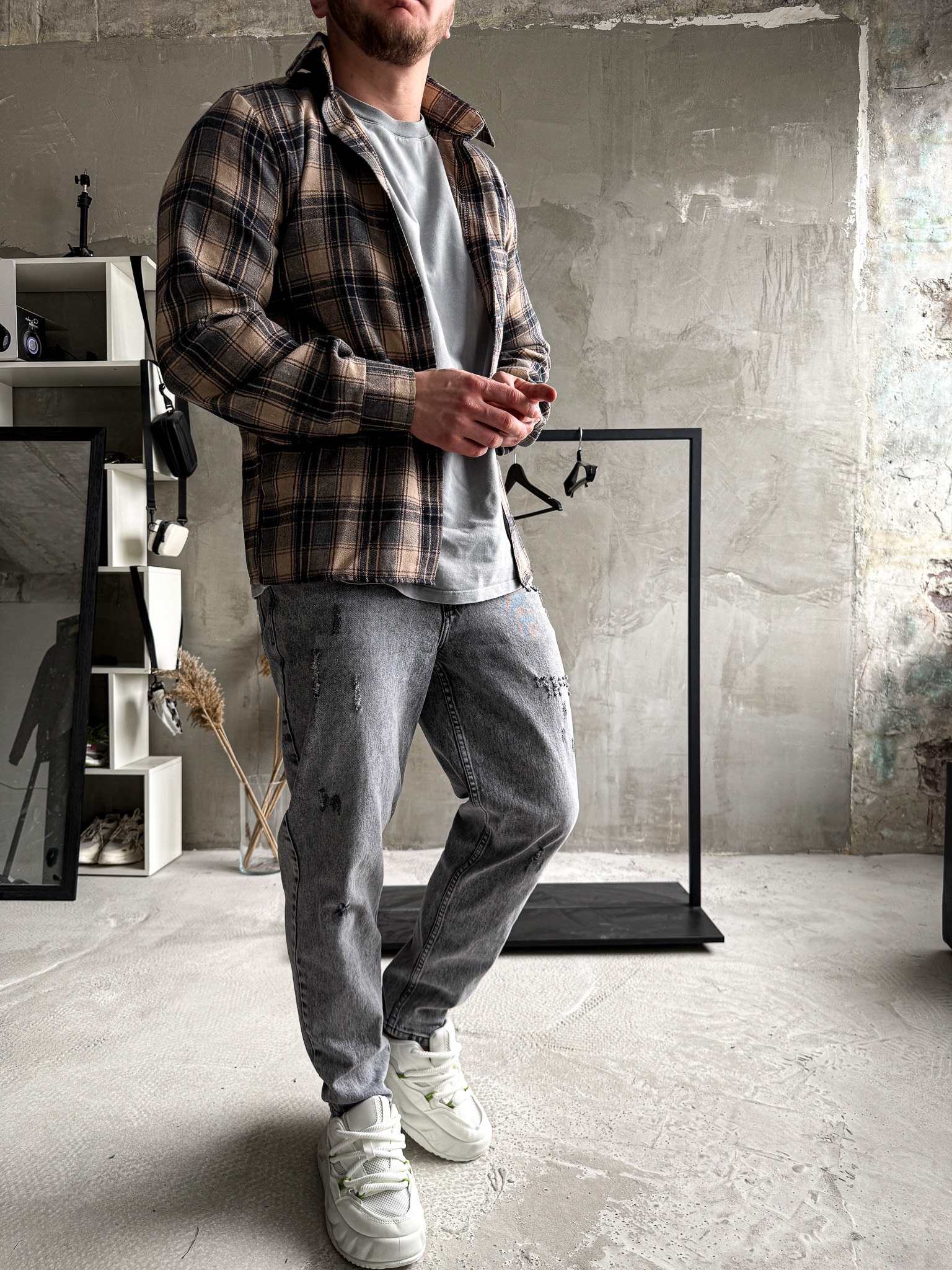 Чоловіча Картата Бежева Сорочка Вільного Крою – Байкова Тепла